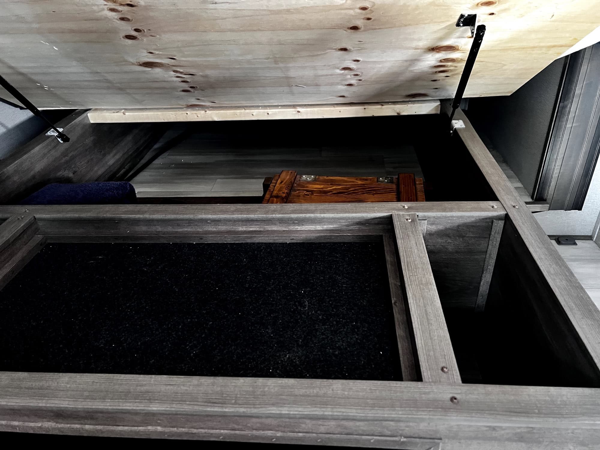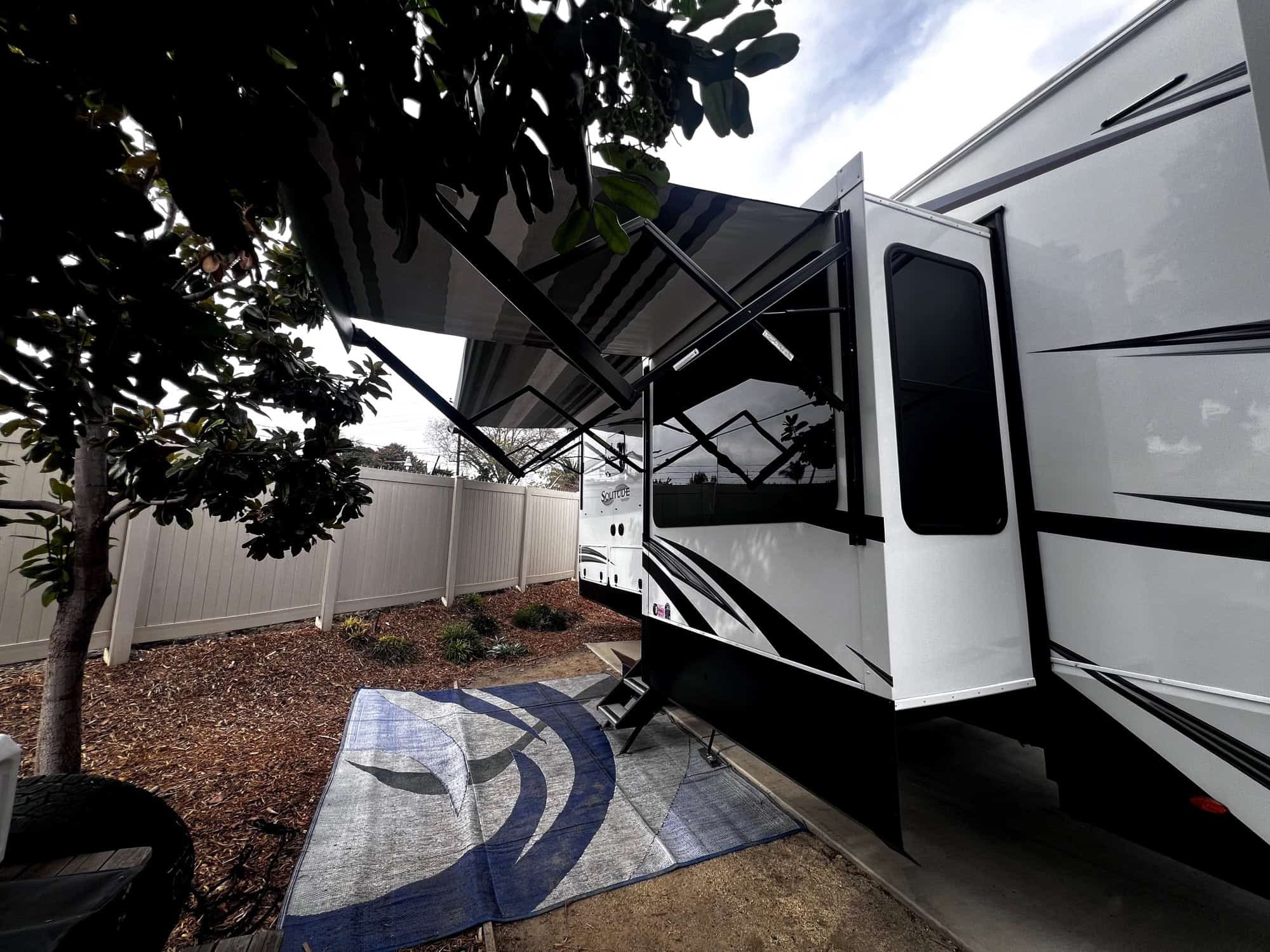 Exterior Highlights: Two power awnings (16′ and 6′ 6″), heavy-duty G-rated tires with NitroFill, 6-point hydraulic leveling system, and under-unit LED light kit.