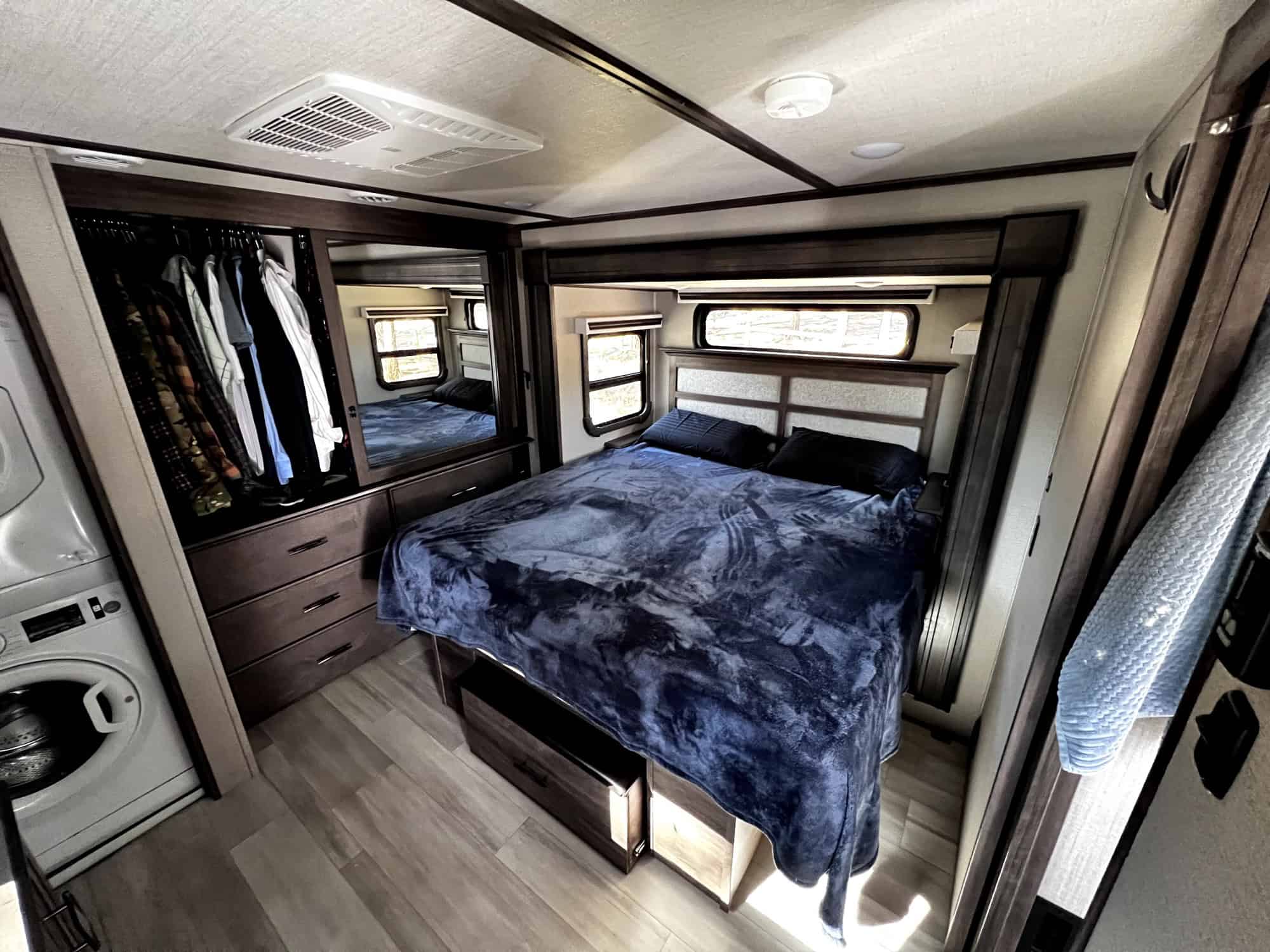 Master Suite: Rear master bedroom featuring a queen bed (king optional), flip-top dresser with LED TV, ample closet space, and a pull-out ottoman.