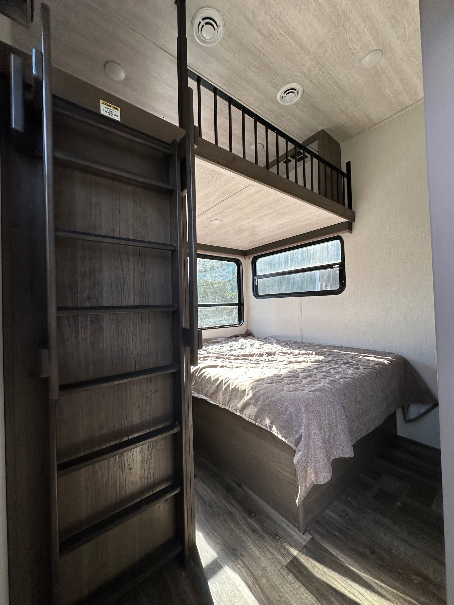 The master bedroom offers a comfortable queen-sized bed, while the bunkhouse provides additional sleeping space for guests or children. The bathroom features a walk-in shower, toilet, and sink, making it easy to freshen up after a day of exploring.
