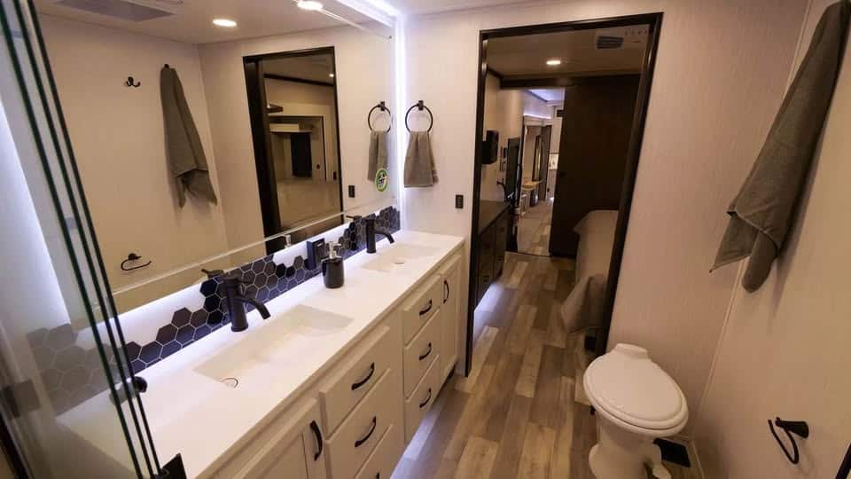 2021 Forest River Cedar Creek 388RK, This Cedar Creek fifth wheel with a rear kitchen! The kitchen has everything you will need with plenty of counter space, a large pantry to store your canned goods, and a 20-cu. ft. stainless steel refrigerator to store any leftovers, and you can enjoy your meals at the free-standing table. Instead of a desk next to it like on the standard floorplan, we put in an extra set of recliner chairs on the slide and power theater seating across from the entertainment center with a fireplace and a 50″ flat screen TV above it. The half bathroom has a closet that has a washer and dryer already installed and ready to go! The front full bathroom has a large walk-in closet with shelves, a shower with a linen closet to store your towels, and a central vacuum system.
