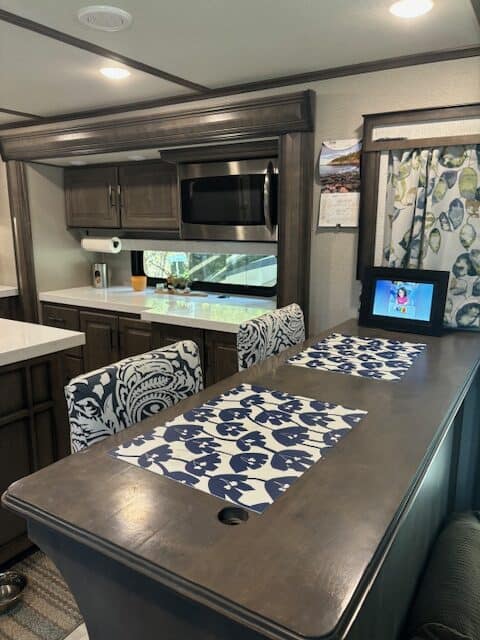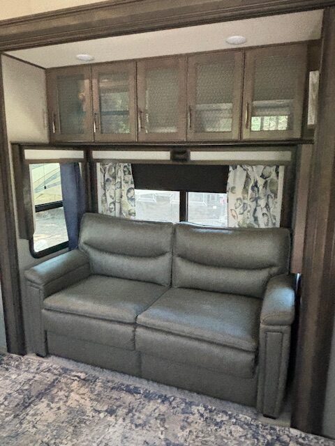 With a rear kitchen design, this 5th Wheel is your home away from home! The kitchen features 18 cu.ft. stainless steel residential style refrigerator, gas range, microwave, center island and storage galore!