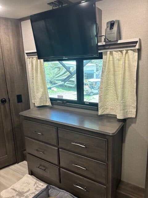The bedroom features a king sized bed, large closets, built in dresser with lift top and under bed storage.
