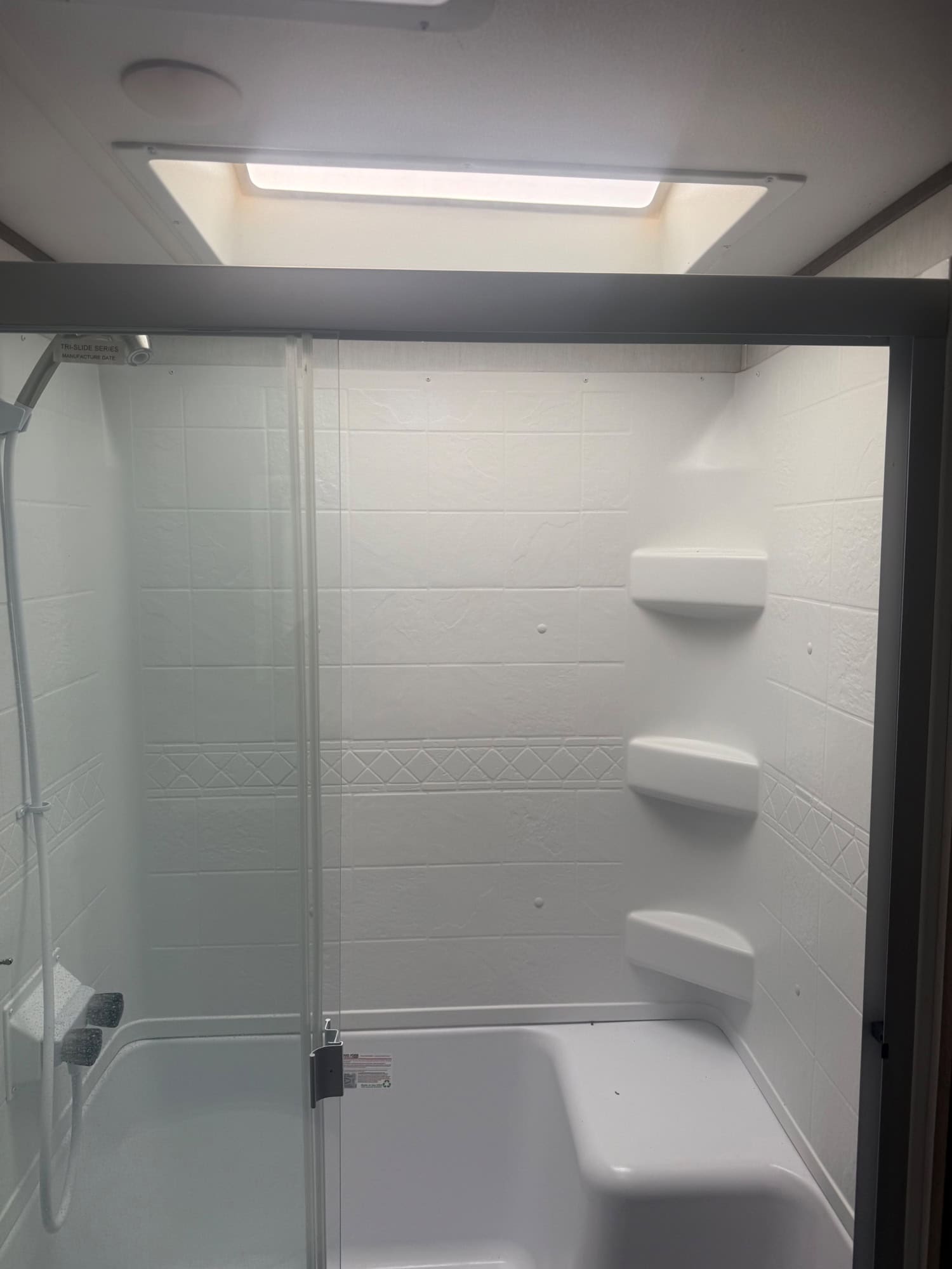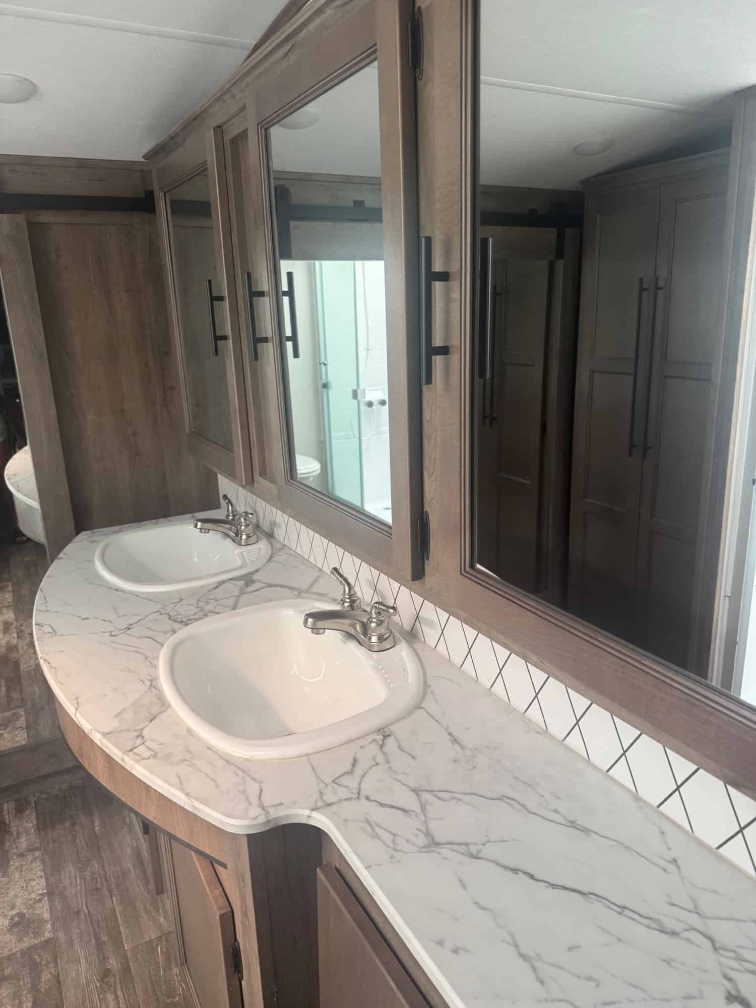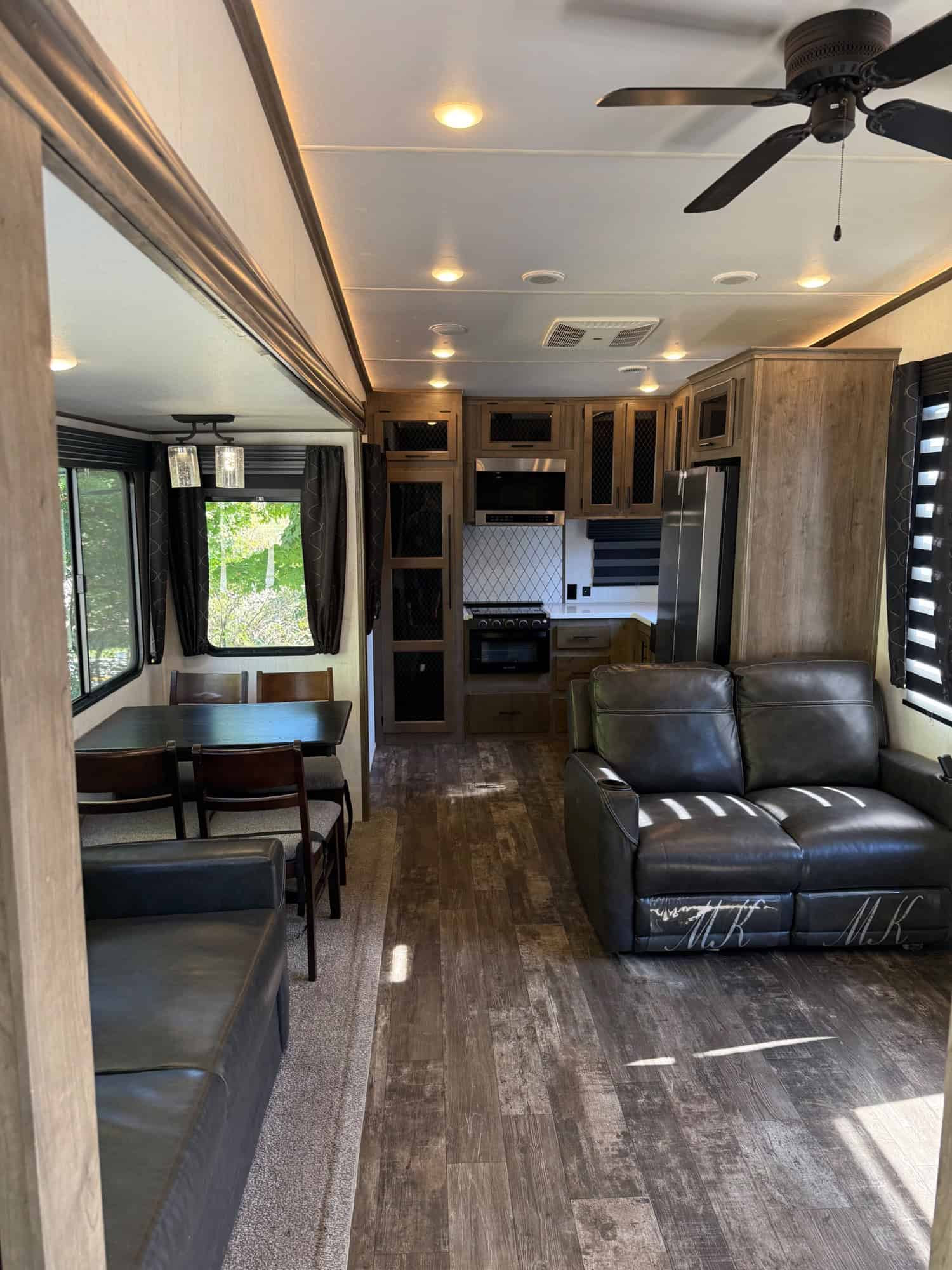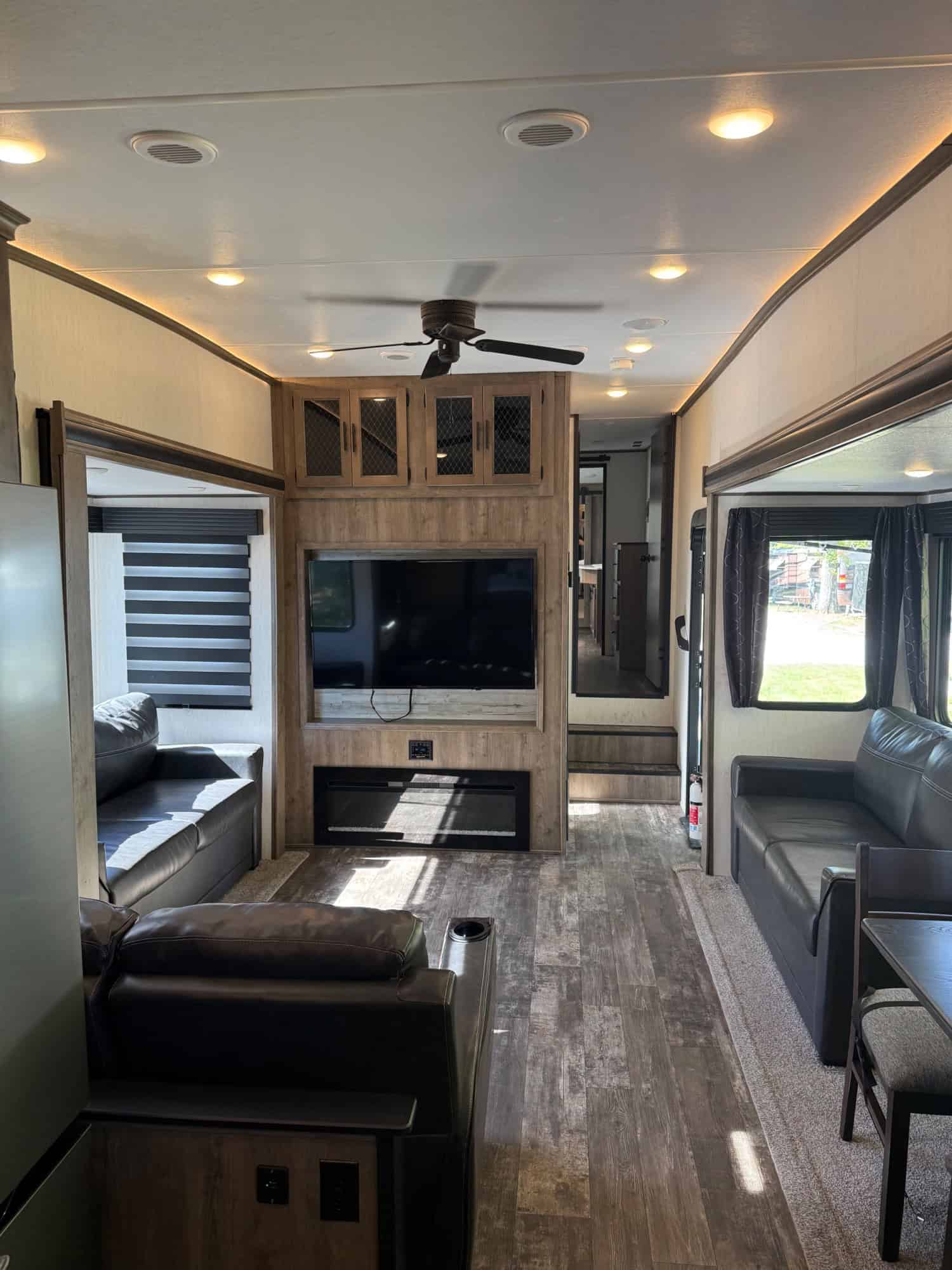 This RV is in pristine condition. Everything operates well, is clean, and there is no damage to speak of. My wife and I bought this RV to live in while we looked for land to build a home. We have recently found the home we want that is already built and no longer need the RV and want to sell to manage the new mortgage. This RV has 3 slide outs, all with slide toppers for protection already installed. It also has an awning, lights included. There is a solar panel installed on the roof for battery charging when not hooked up, and has inside and outside speakers that all work. This model has two bathrooms, one with toilet and sink and the other is the master bath with two sinks, toilet, and shower with sliding doors. This model also has a luxury seating in an open spaced living room with 3 couches, two of them that slide out as beds and one with entertainment seating complete with massager and heated seats. There is a propane fireplace in the living room as well that serves for ambiance as well as actual heat for colder camping. The fridge is residential sized, and this model also has two A/C units. There is a massive amount of storage all throughout the RV. This model has a 49 gal fresh water tank, and 76 gal black/gray water tanks.