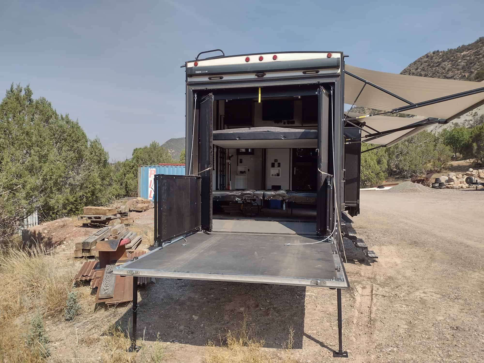 Possible package option to include 2019 Ford F-450 Platinum Edition 6.7 PowerStroke diesel dually with 59,000 miles. Trailer must sell before or with truck only. Optioned out with toy hauler bathroom deleted to add more water storage for boondocking. Solar added. Four season use. $145,000 for package, with truck.