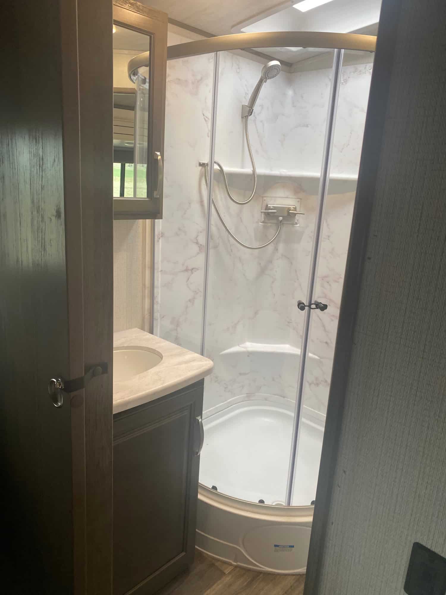 Climate Guard protection package, Auto Leveling, Hyperdeck High Performance Water resistant RV floors, Key TV, Color Coded and Numbered Wiring, Amy Gray Signature Interior Design, Slim Shade on Entry Door, Girard On Demand Water Heater, 12 V Furrion Refrigerator. 6165 Weight, 1635 Carrying Capacity, 640 Hitch Weight, 60 Gallon Fresh water tank. 76 Gallon Gray water tank, 38 gallon Waste water tank, 60 LPG, 8′ wide, 11’3″ High, 20′ Awning. I’ll include a spec sheet in the photos. It also comes with custom Airskirts and has a protector over the bump out which I purchased extra. The trim is 24SABWE and it sleeps five. I have not even dewinterized it so nothing has been used. Please see spec sheet for more info. Video available.