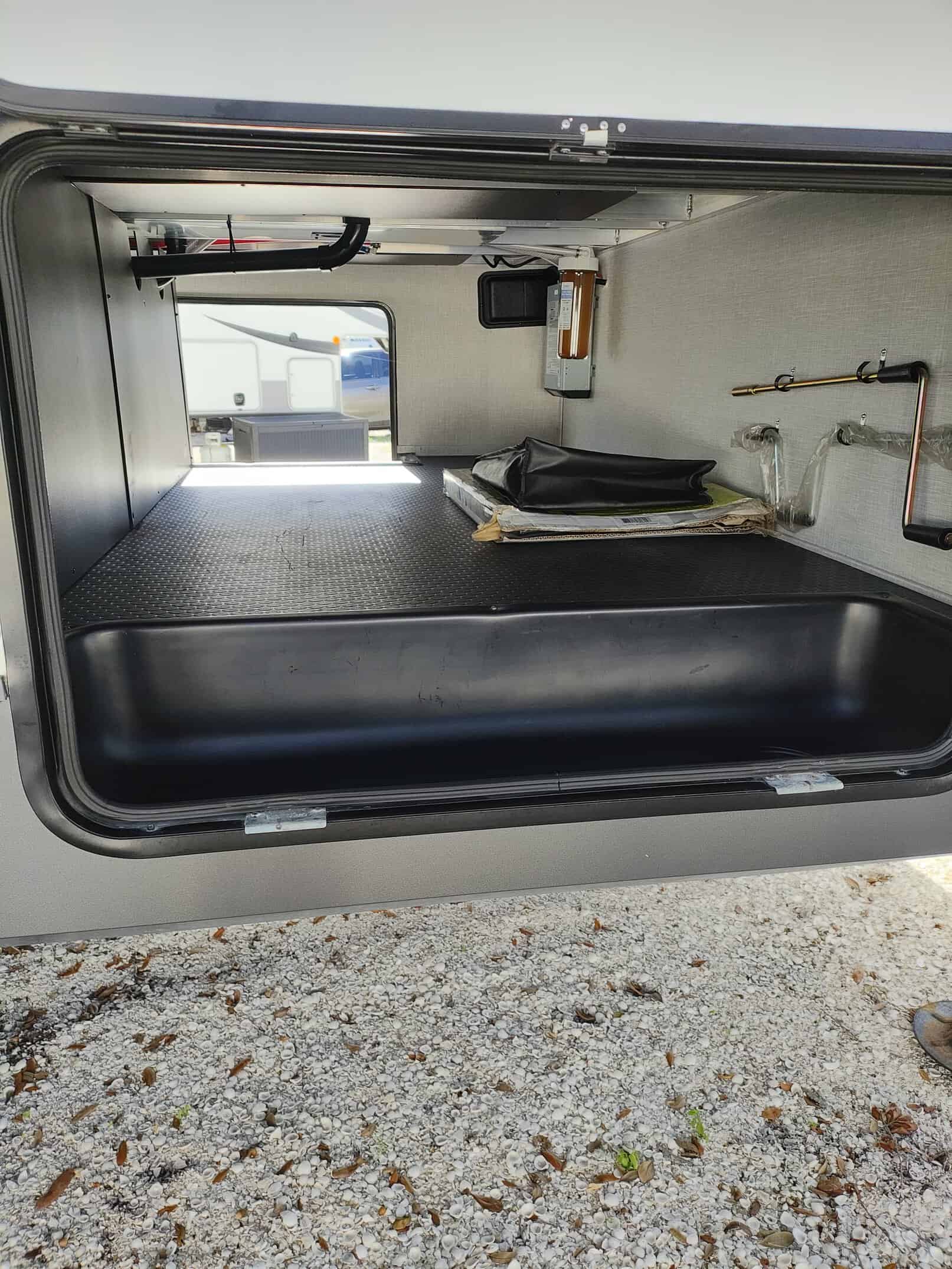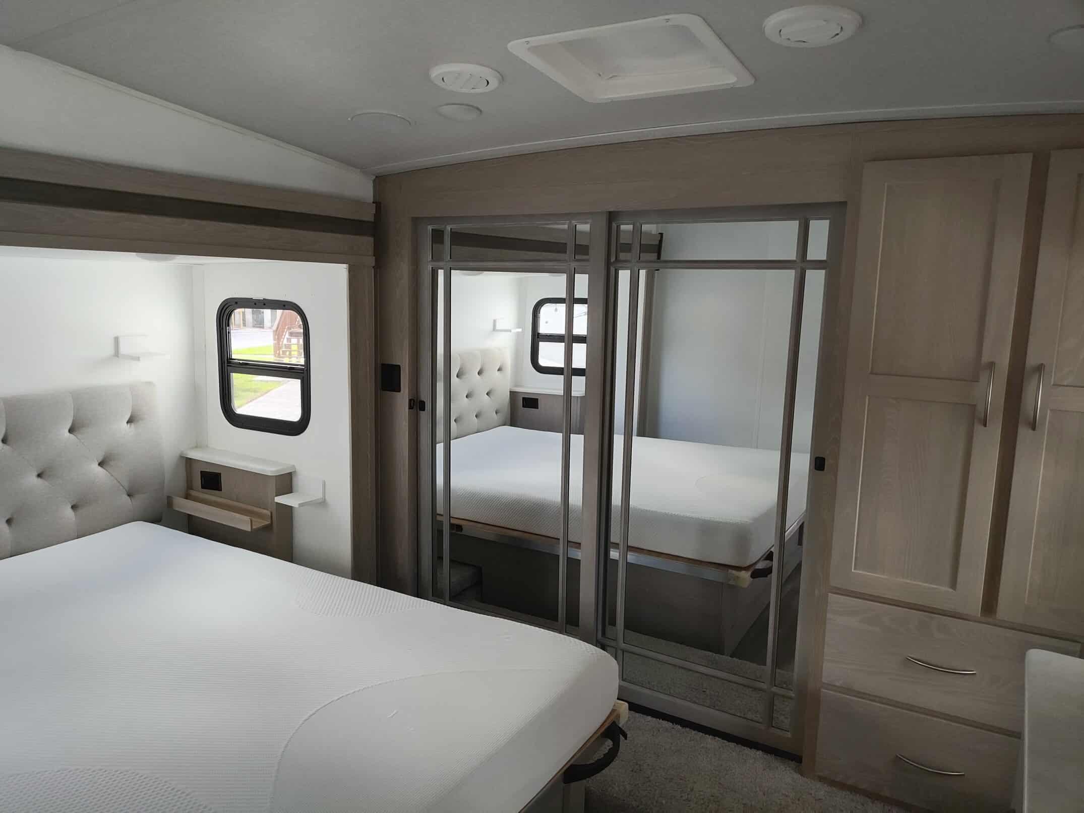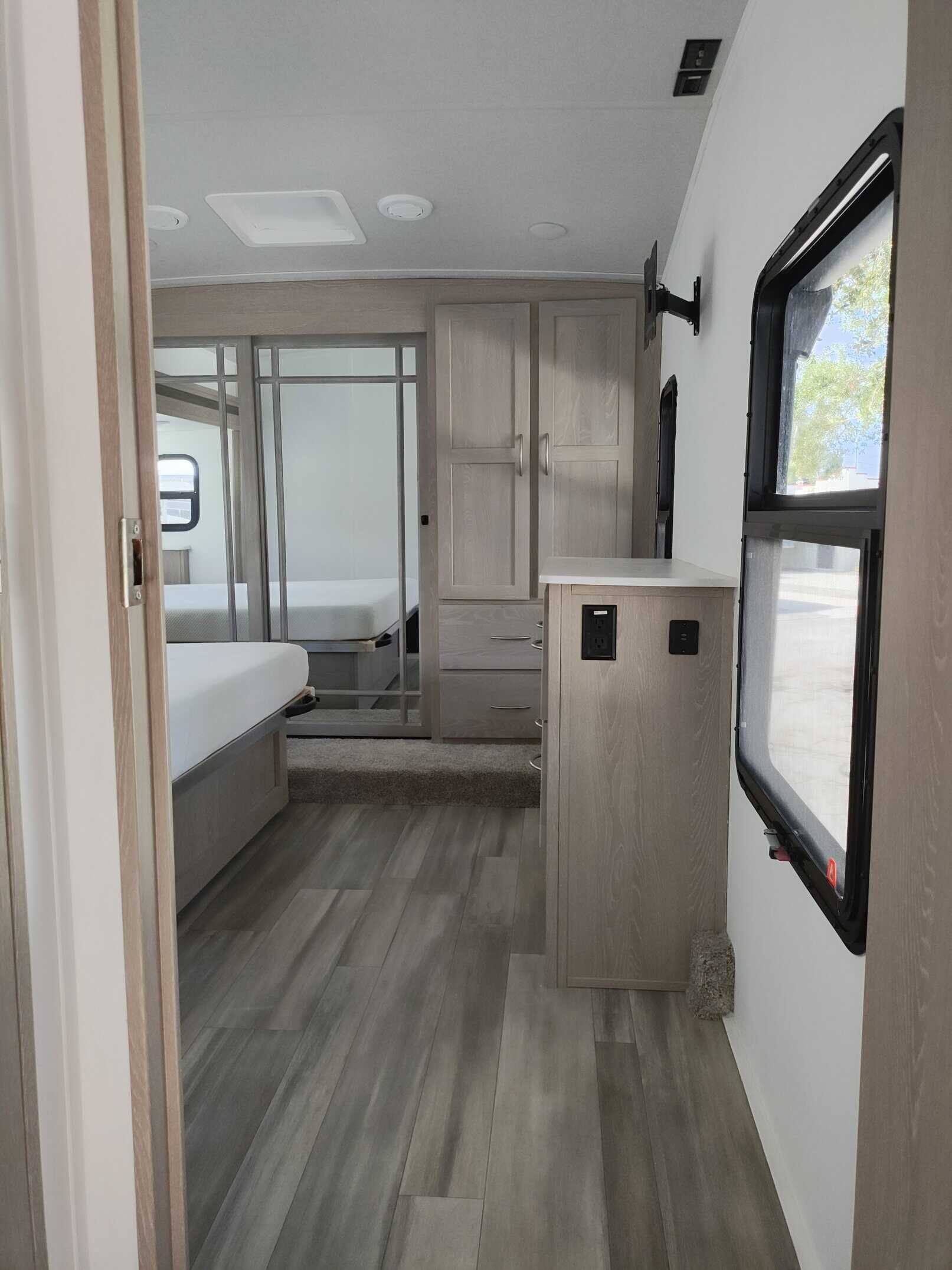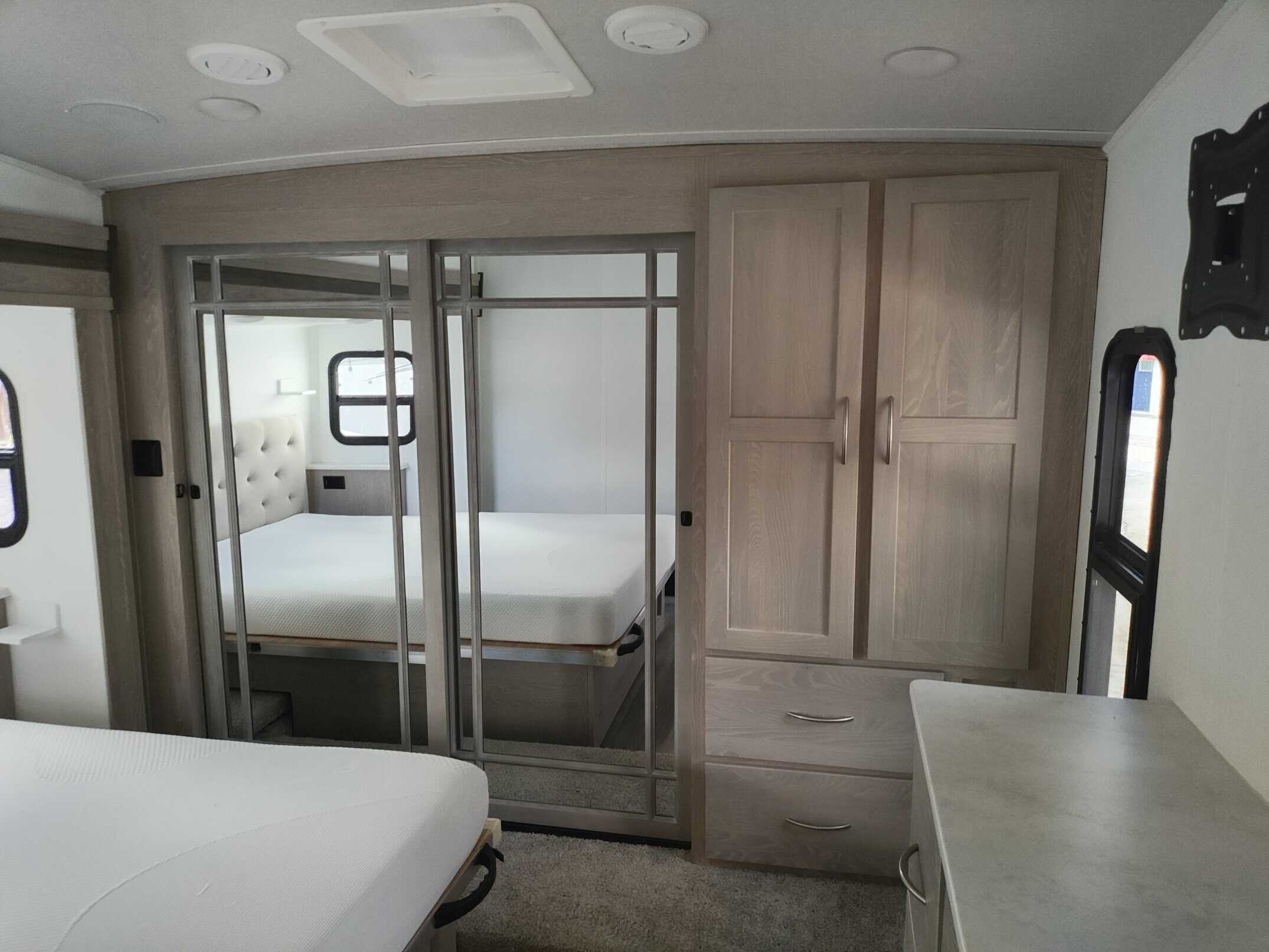 4.0 leveling system, thermopane windows, Maxxair power fan with remote control, 15,000 ducted A/C, two slide toppers, 190 Watt roof mounted solar panel, 1000 Watt inverter, water filter (never used) carbon monoxide detector, turning point rotating pin box, multi zone stereo/DVD/AM/FM radio with speakers in the bedroom and outside, power awning with lights, power stabilizer jacks, Mor-ryde strut assist steps, 43″ TV, ceiling fan, shower miser, enclosed underbelly with thermostatically controlled heated holding tanks, spare tire mounted underneath, black tank flush, Dexter torflex torsion axles with aluminum wheels, Goodyear Endurance tires with tire pressure monitoring system.