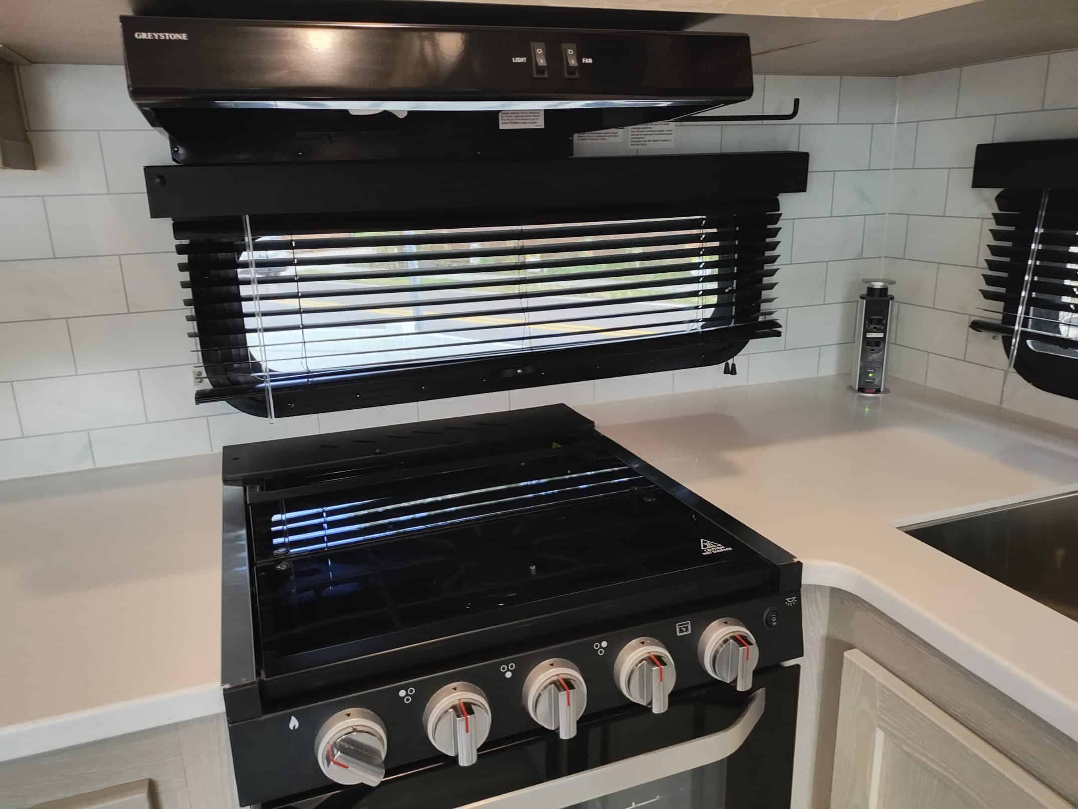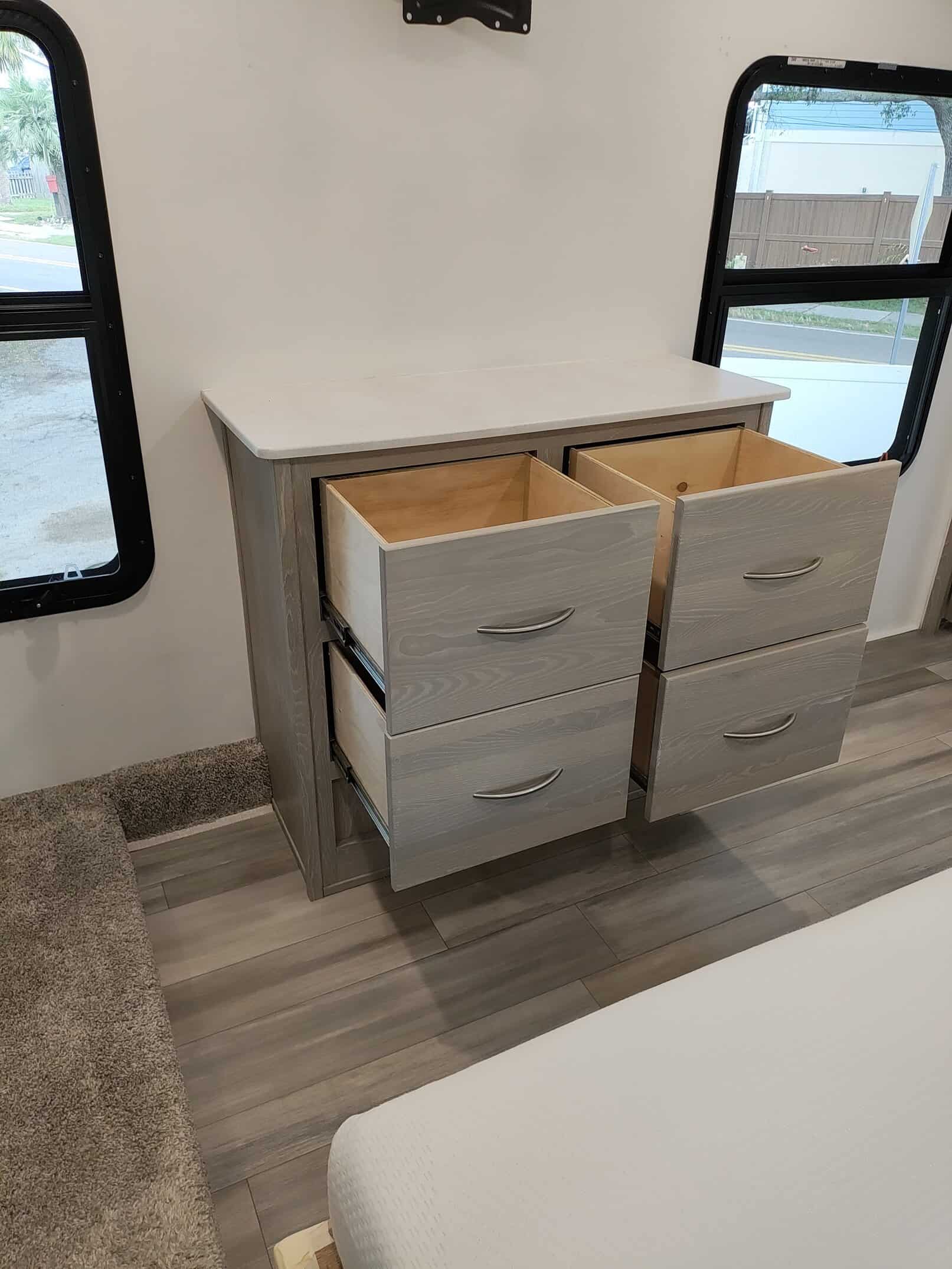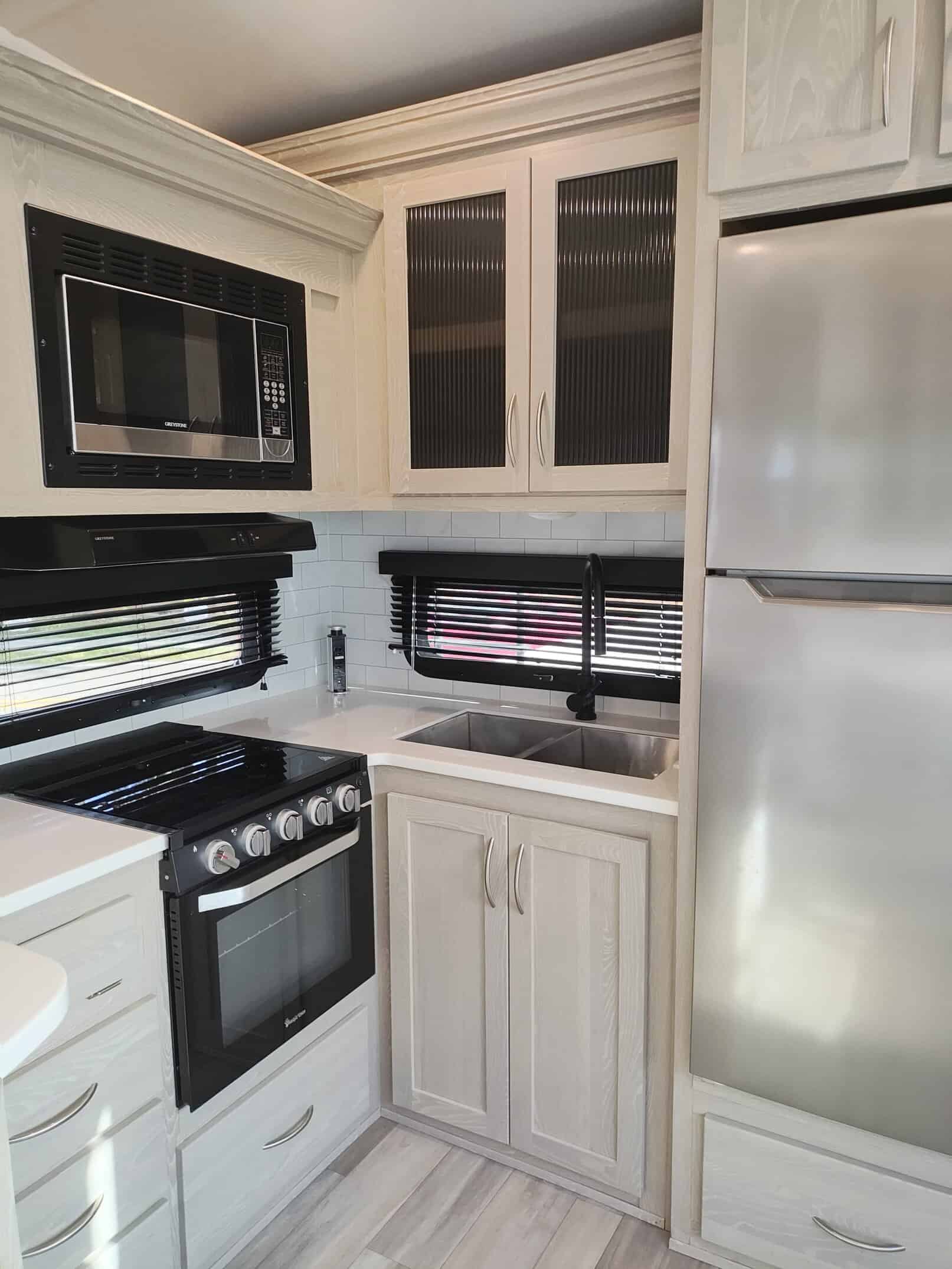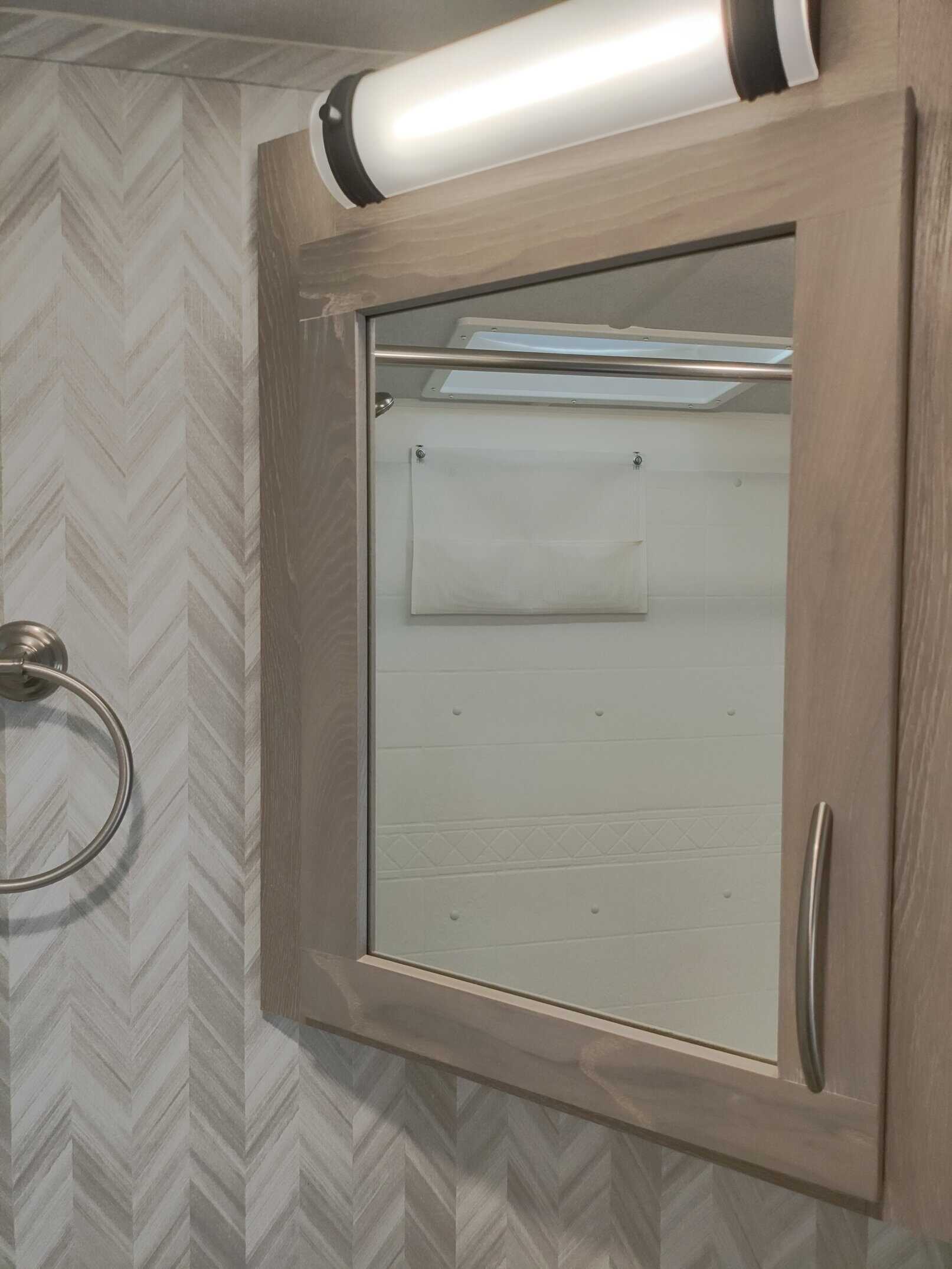 4.0 leveling system, thermopane windows, Maxxair power fan with remote control, 15,000 ducted A/C, two slide toppers, 190 Watt roof mounted solar panel, 1000 Watt inverter, water filter (never used) carbon monoxide detector, turning point rotating pin box, multi zone stereo/DVD/AM/FM radio with speakers in the bedroom and outside, power awning with lights, power stabilizer jacks, Mor-ryde strut assist steps, 43″ TV, ceiling fan, shower miser, enclosed underbelly with thermostatically controlled heated holding tanks, spare tire mounted underneath, black tank flush, Dexter torflex torsion axles with aluminum wheels, Goodyear Endurance tires with tire pressure monitoring system.