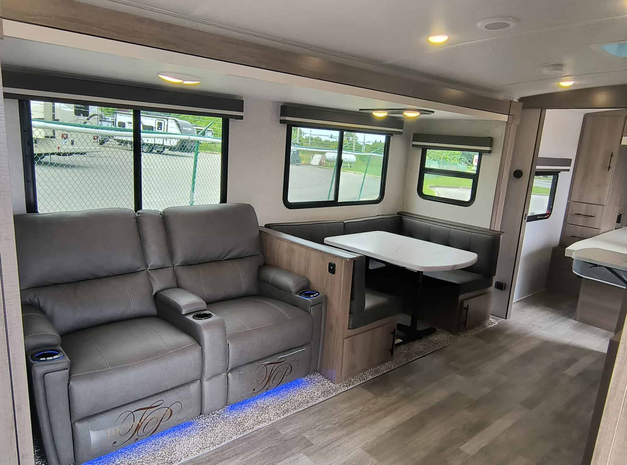 Theater seating including massage and heated seating with trifold sofa + booth dinette