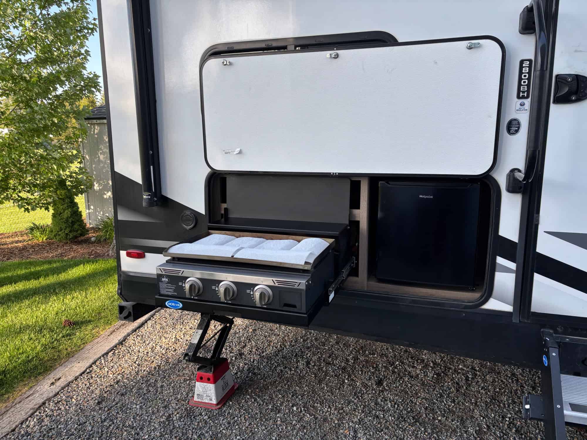 Weight distribution hitch and Cummins onan generator available at additional cost, as well as stabilizing jack blocks, leveling blocks, outdoor mat, fresh water hose, black water drain hose, 30 amp surge protector, folding camping tables, and a few other odds and ends.