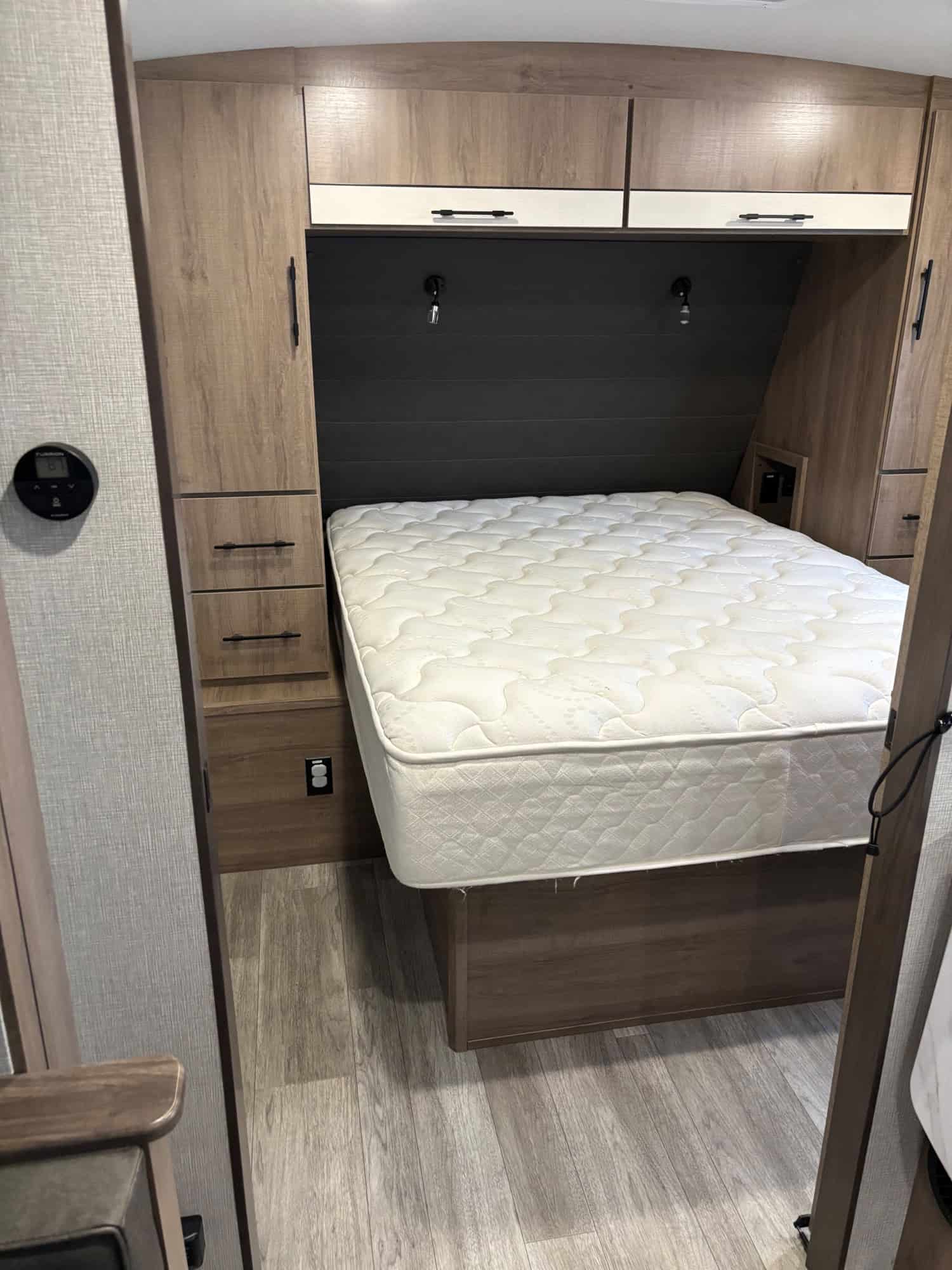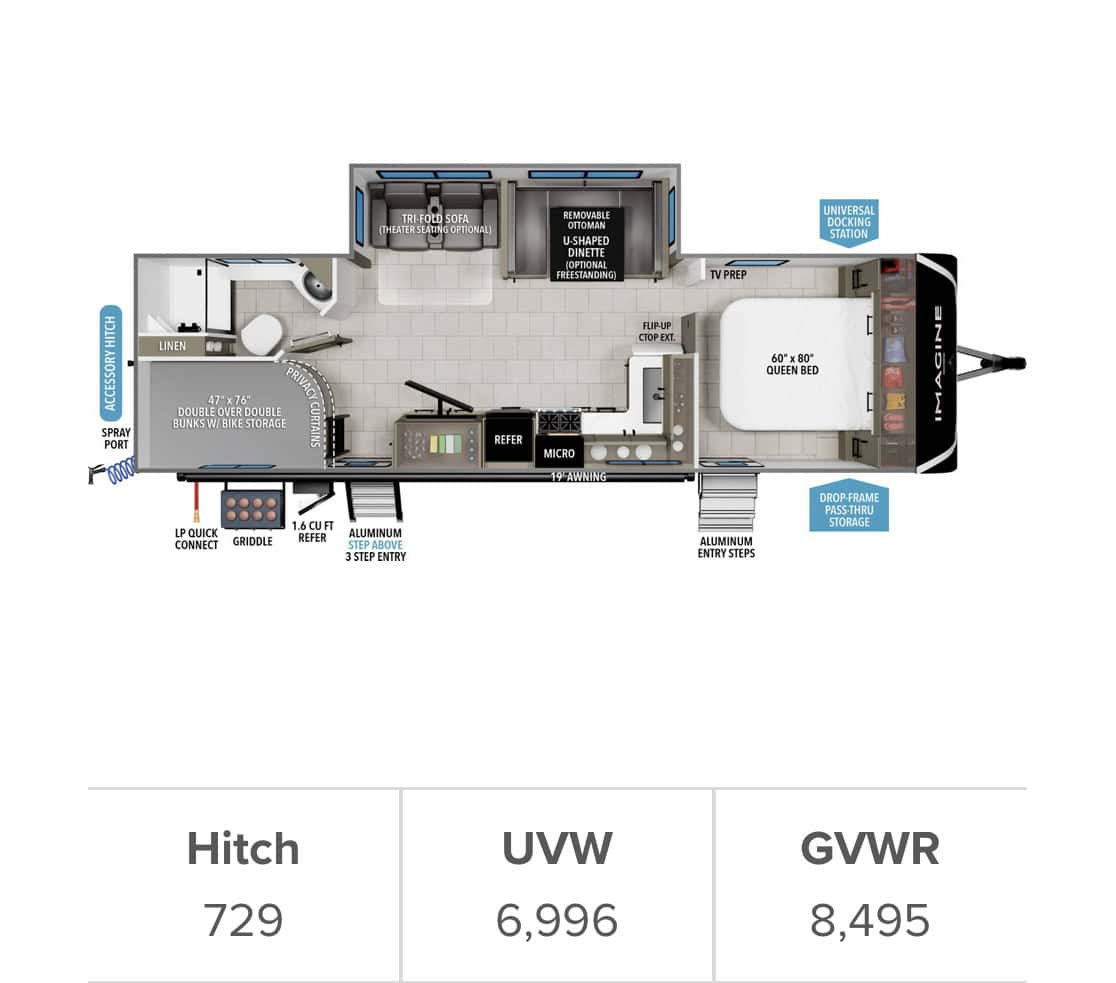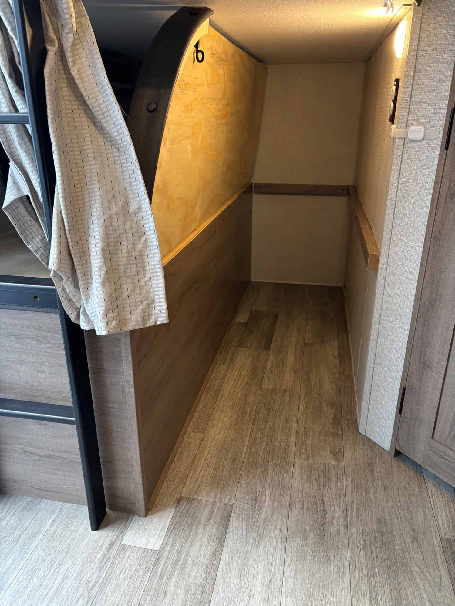 Double bunk in rear with privacy, bottom folds, mattress available for bottom, just not shown in the pictures