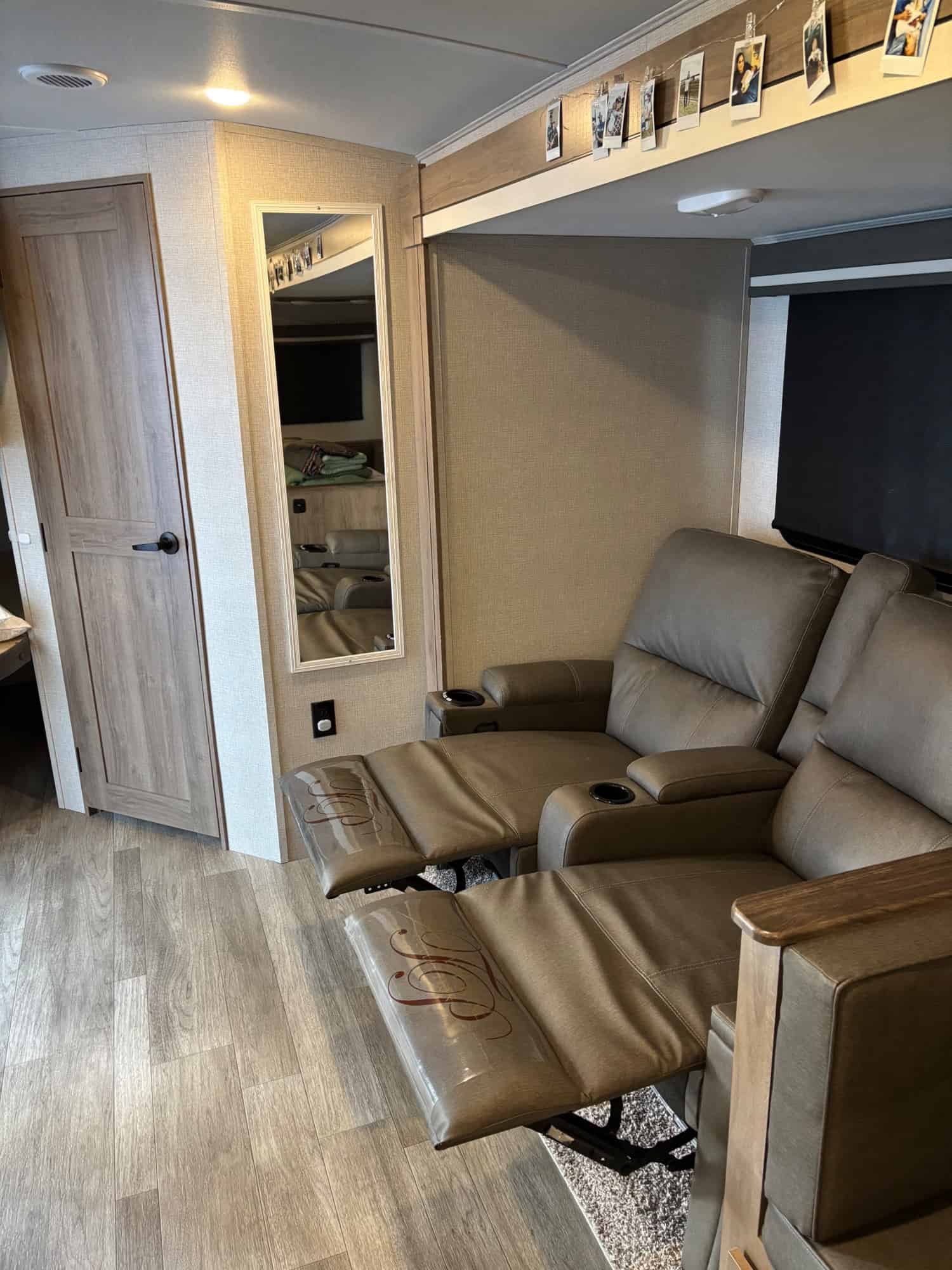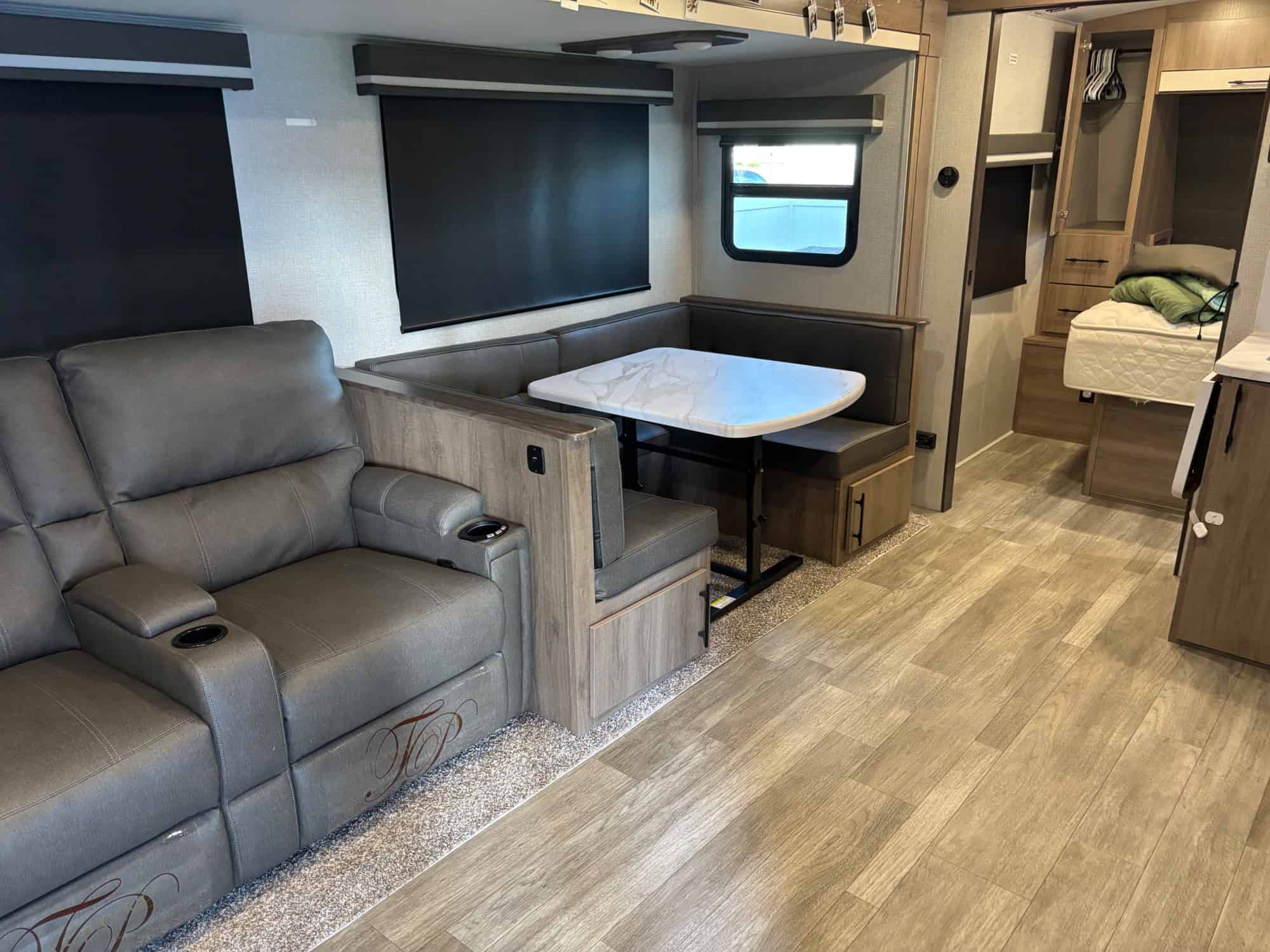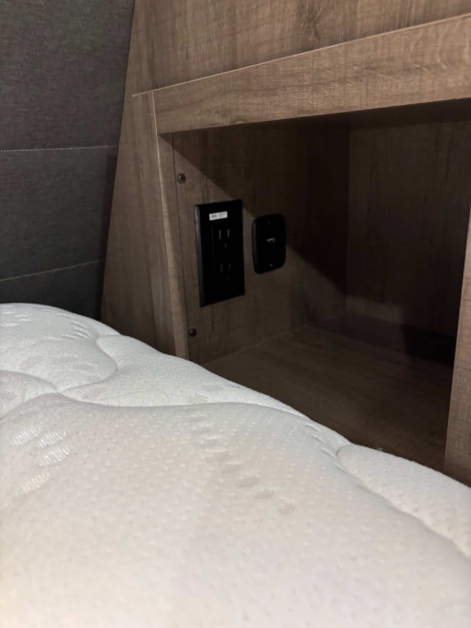 Double bunk in rear with privacy, bottom folds, mattress available for bottom, just not shown in the pictures