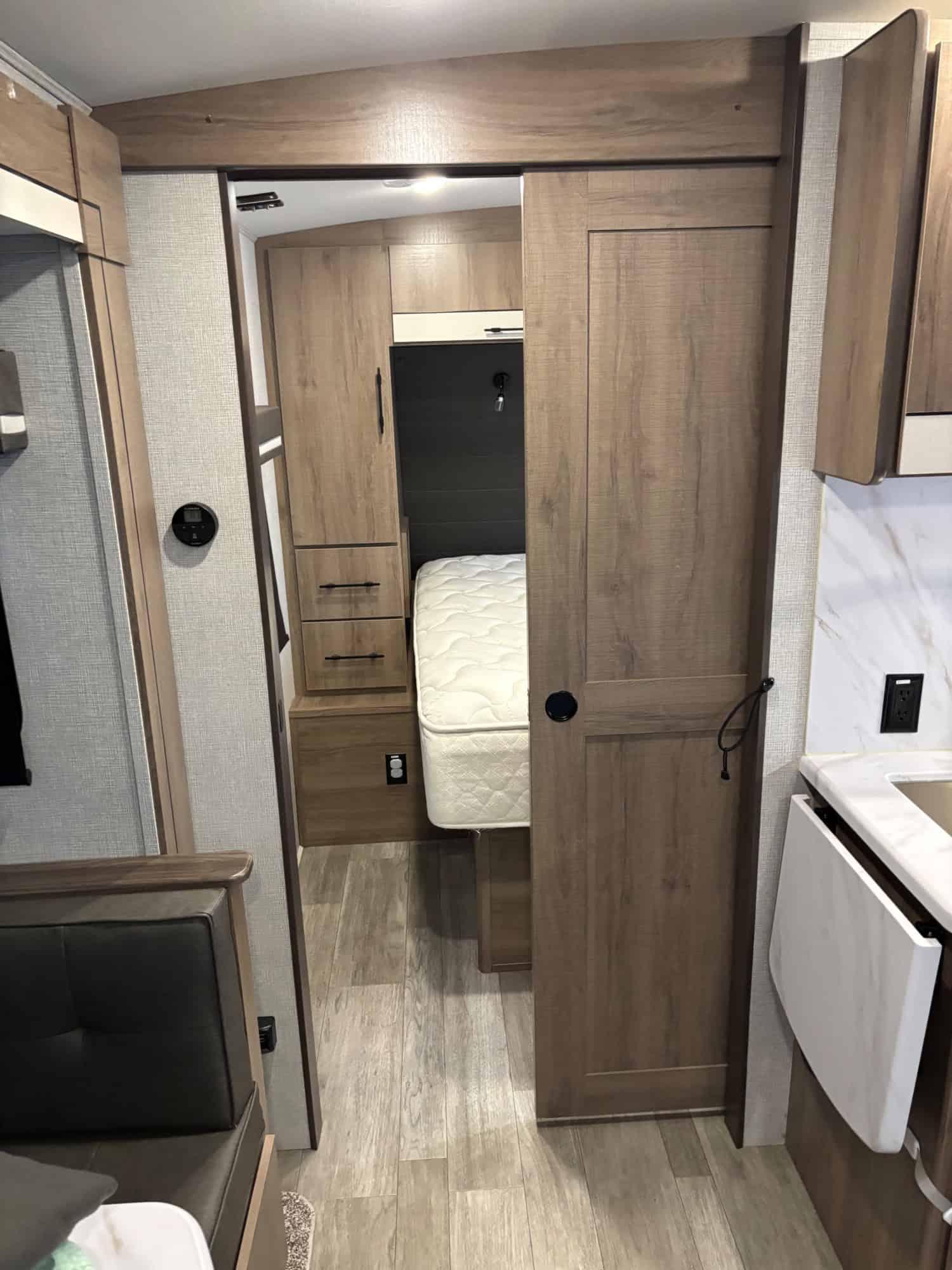 Sliding barn privacy door in bedroom with alternate outdoor access door