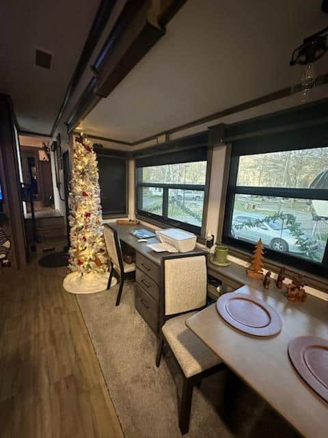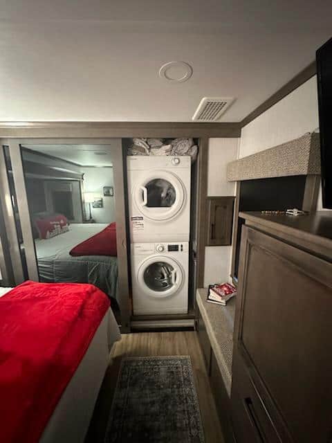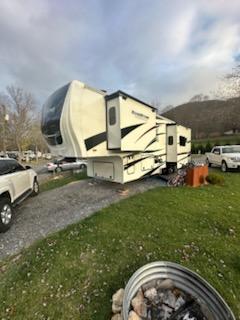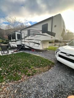 This is a beautiful 5th wheel. Set up for fulltime RVing. The unit has 3" thick walls, three A/C units with center unit being a high-performance heat pump, electric fireplace, gas furnace, premium electronics package with JBL audio system, firefly integrated touch control, 65" Samsung Smart RV. 55" TV in bedroom, 1000W inverter 190 W Solar panel w/30 AMP controller, slide room awnings with weather shields on them, 30" stainless steel convection microwave oven, standard size refrigerator, washer and dryer, king size bed and sleeper sofa, and so much more. This 5th wheel has only traveled from the dealership in Greer SC to Maggie Valley NC and been set up sense. To many extras to list.