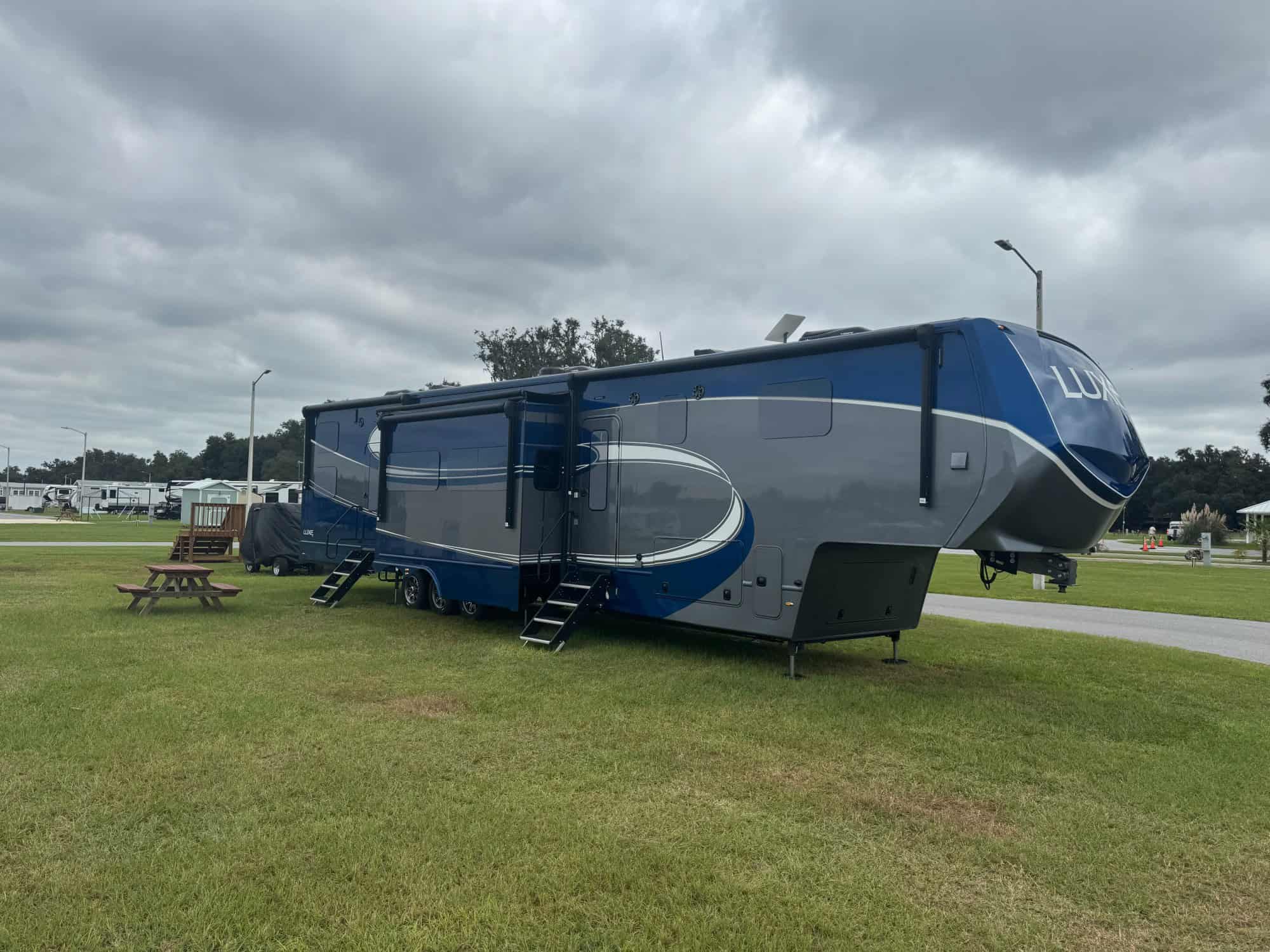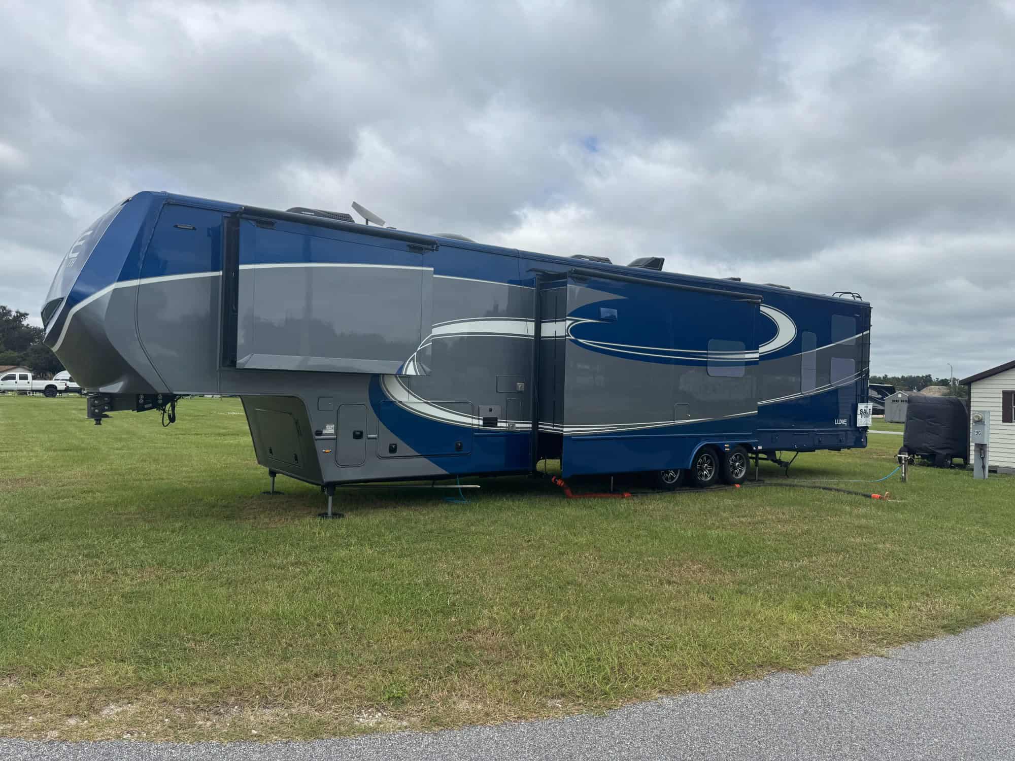 Three power side patio awnings and 1 power awning over rear deck.
