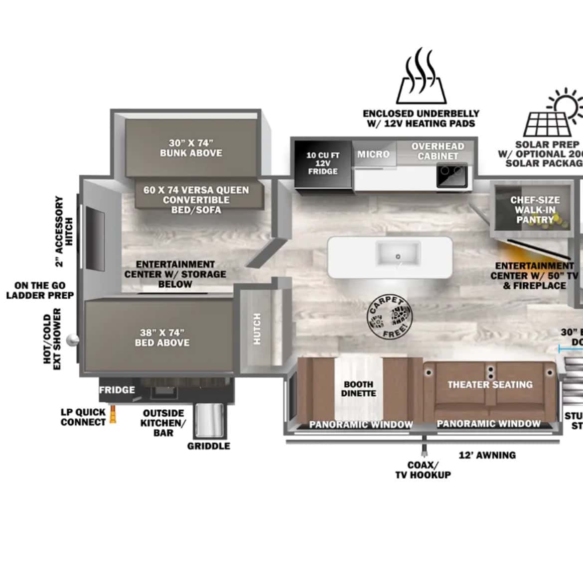 Other features include an outdoor kitchen, and outdoor shower, instant hot water, upgraded batteries, and a huge pass through storage area in the front. This trailer will come with a water hose, a sewer hose and sewer hose supports, and wheel chocks.