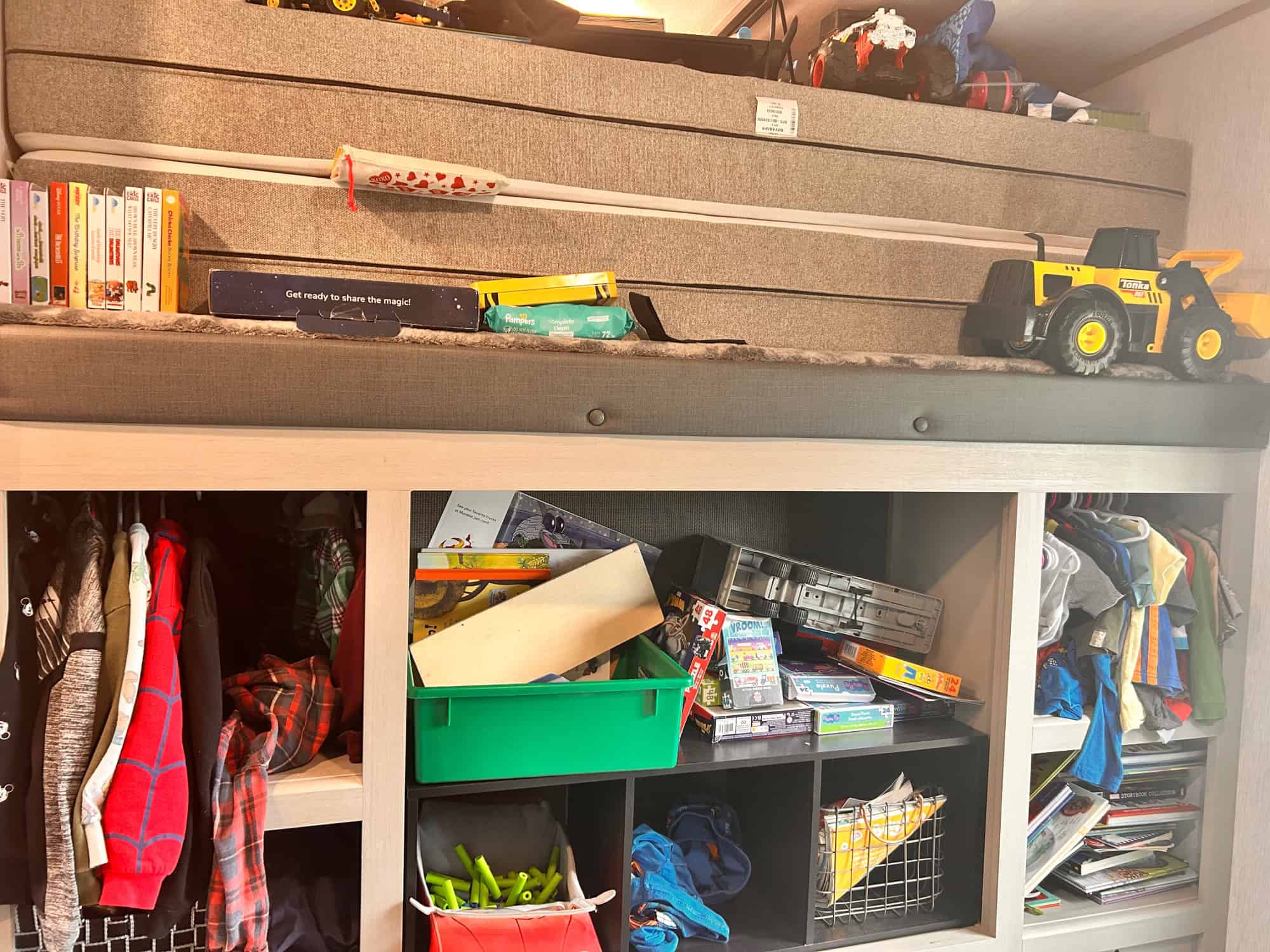 This is a beautiful travel trailer with lots of room for you and your family. With a queen size bed up front, three bunks in the back, and two recliners in the living room, there’s plenty of room for lounging, snoozing and hanging out. The bottom bunk in the back folds out to be a queen sized bed, and the bed in the front? A real, solid mattress, not an RV mattress, for true comfort.