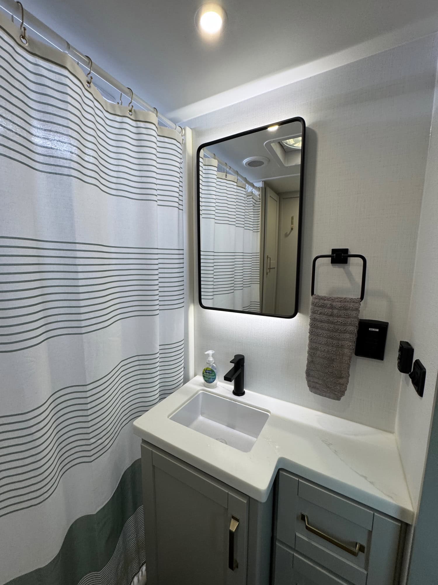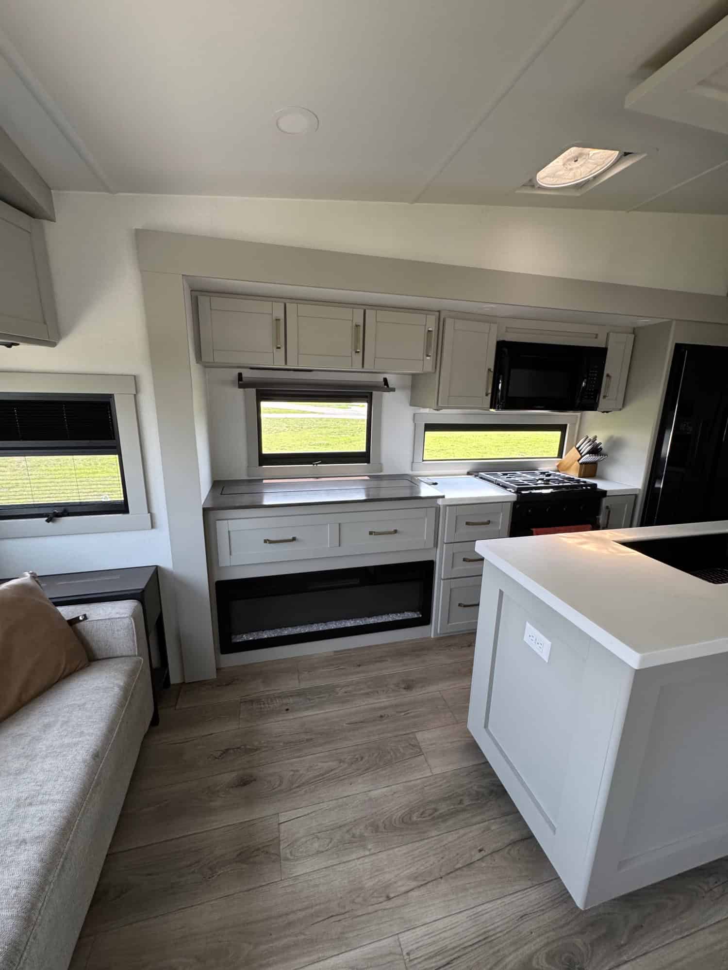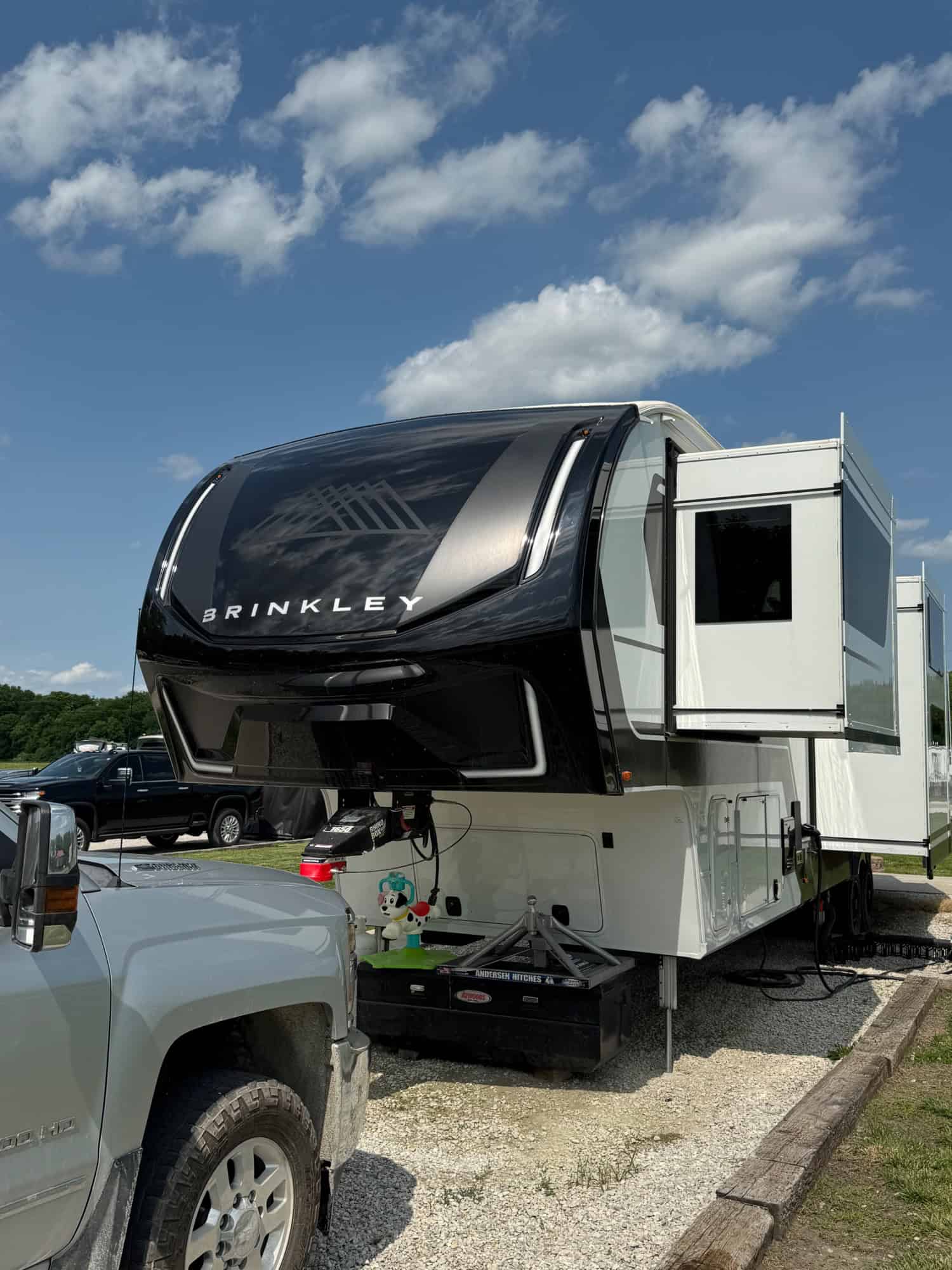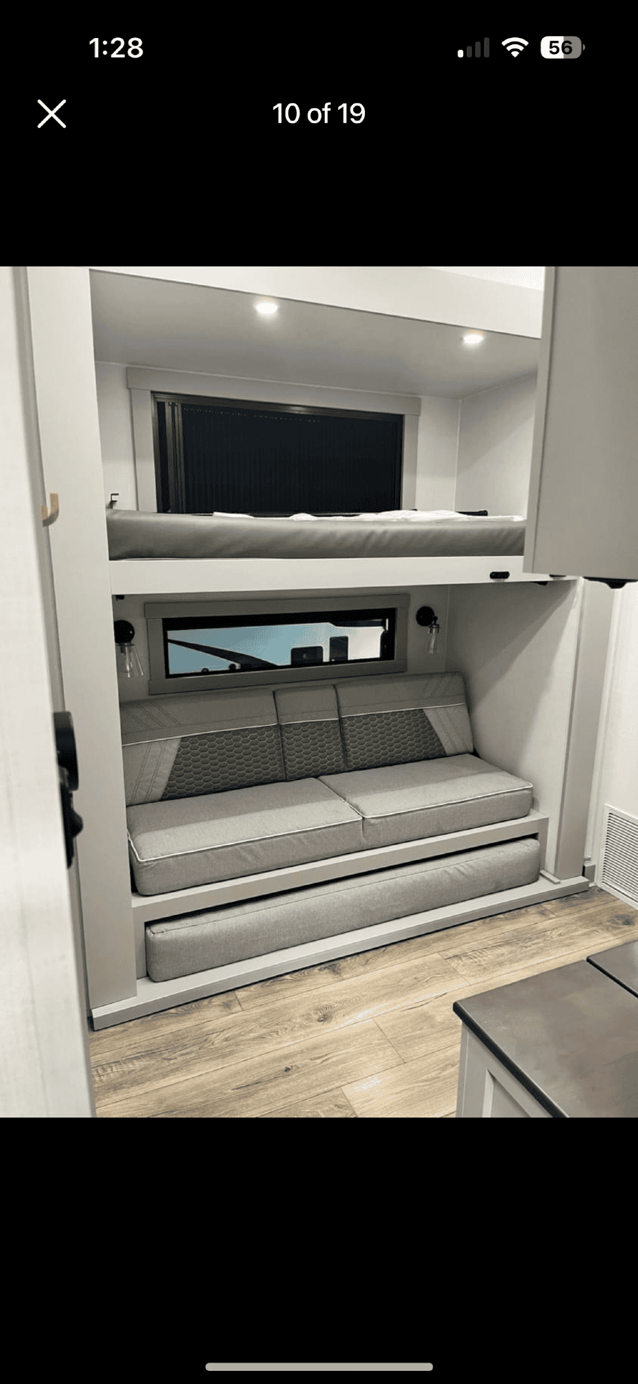 And many more goodies I’m sure I’m forgetting. This camper has been great for us! We have had absolutely zero issues with this beast. This last winter We ran with no skirting with temperatures in the negatives, and to my surprise, nothing froze!! Goes to show the quality of Brinkley. We did get the fridge recall done. We also insulated underneath the bed to take care of the mold issues many early Brinkley’s were having. In the bunk room we did take out the folding couch to make room for a crib. The couch will go with the trailer and can be very easily re installed. It’s only 4 bolts and it comes right out. We also removed the glass shower doors and put a up shower curtain instead because trust me, for full timing, that ring was an ABSOLUTE PAIN to clean!! We purchased a 5 year paint protection warranty, where they put on a sealer and will fix any stains or fading, this can be transferred to the new owners.