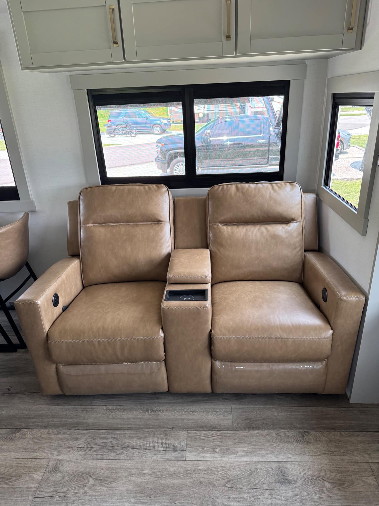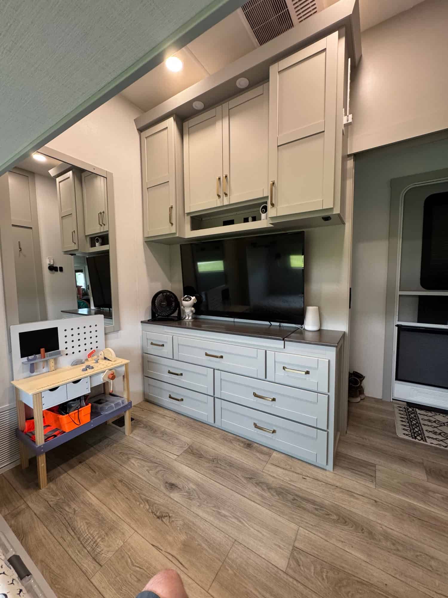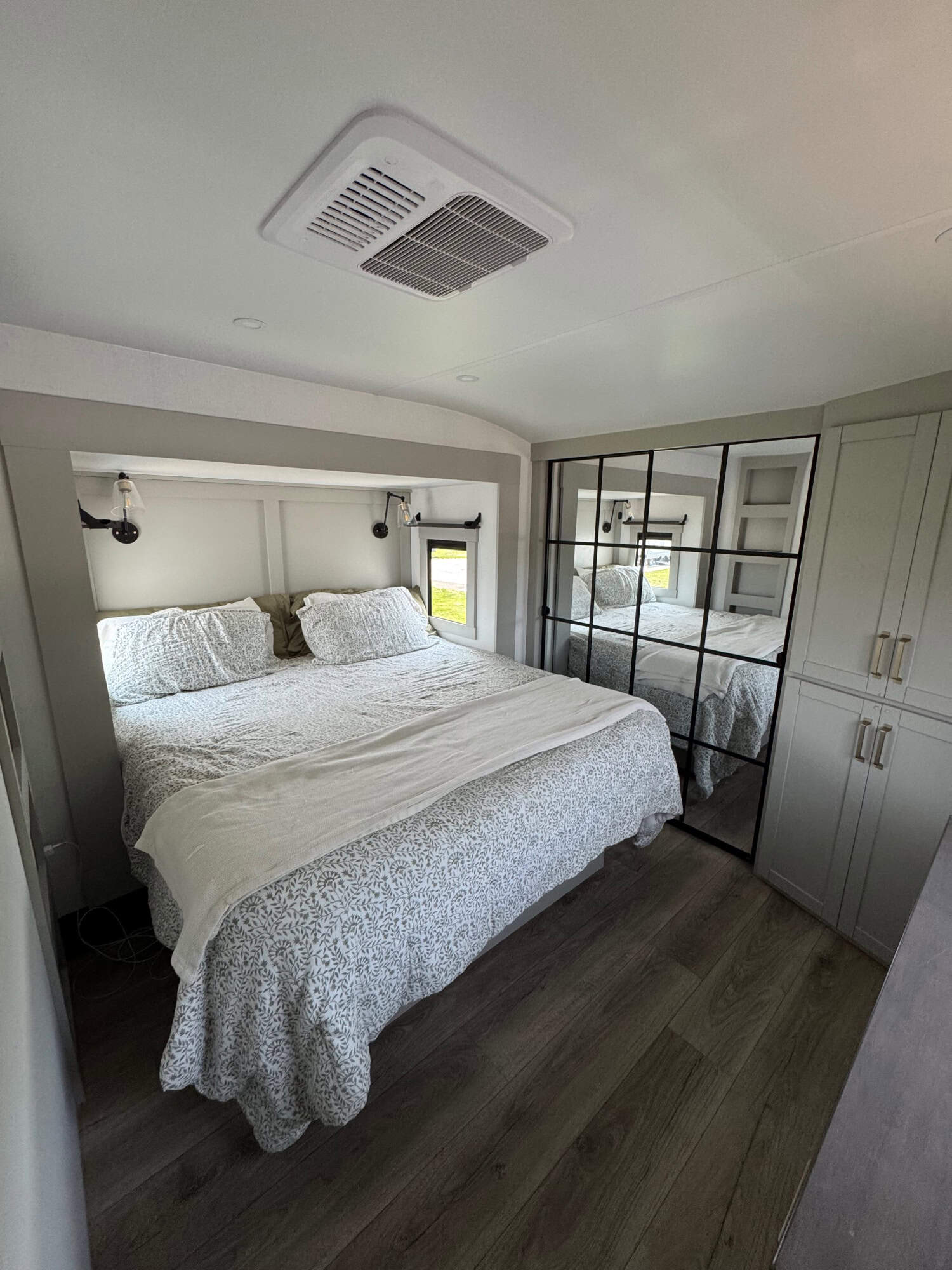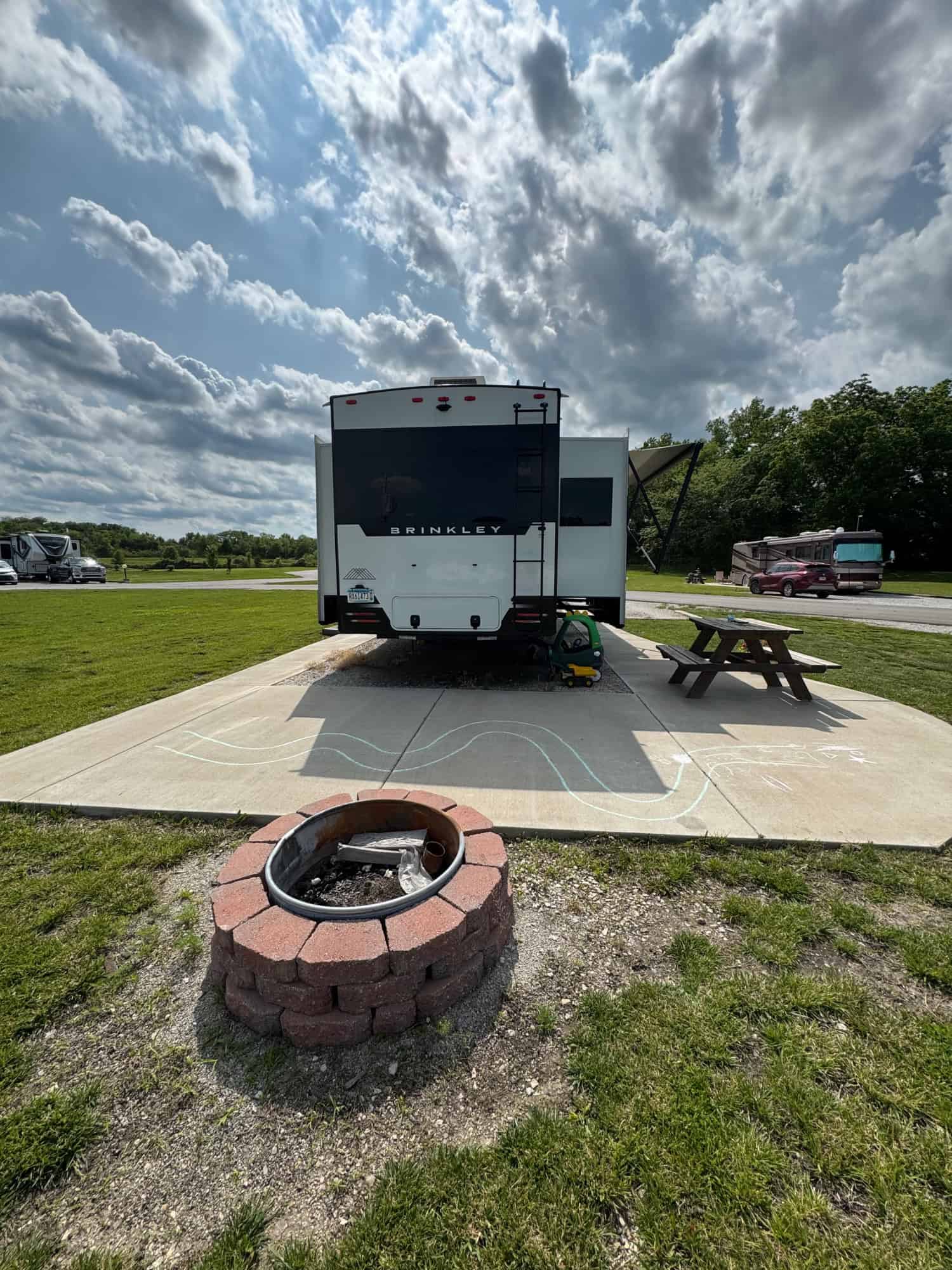 And many more goodies I’m sure I’m forgetting. This camper has been great for us! We have had absolutely zero issues with this beast. This last winter We ran with no skirting with temperatures in the negatives, and to my surprise, nothing froze!! Goes to show the quality of Brinkley. We did get the fridge recall done. We also insulated underneath the bed to take care of the mold issues many early Brinkley’s were having. In the bunk room we did take out the folding couch to make room for a crib. The couch will go with the trailer and can be very easily re installed. It’s only 4 bolts and it comes right out. We also removed the glass shower doors and put a up shower curtain instead because trust me, for full timing, that ring was an ABSOLUTE PAIN to clean!! We purchased a 5 year paint protection warranty, where they put on a sealer and will fix any stains or fading, this can be transferred to the new owners.