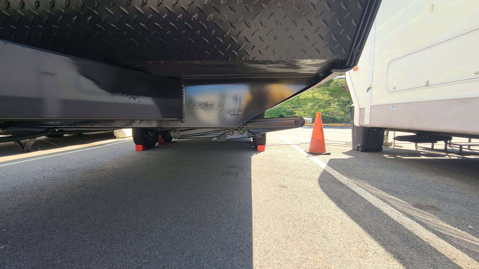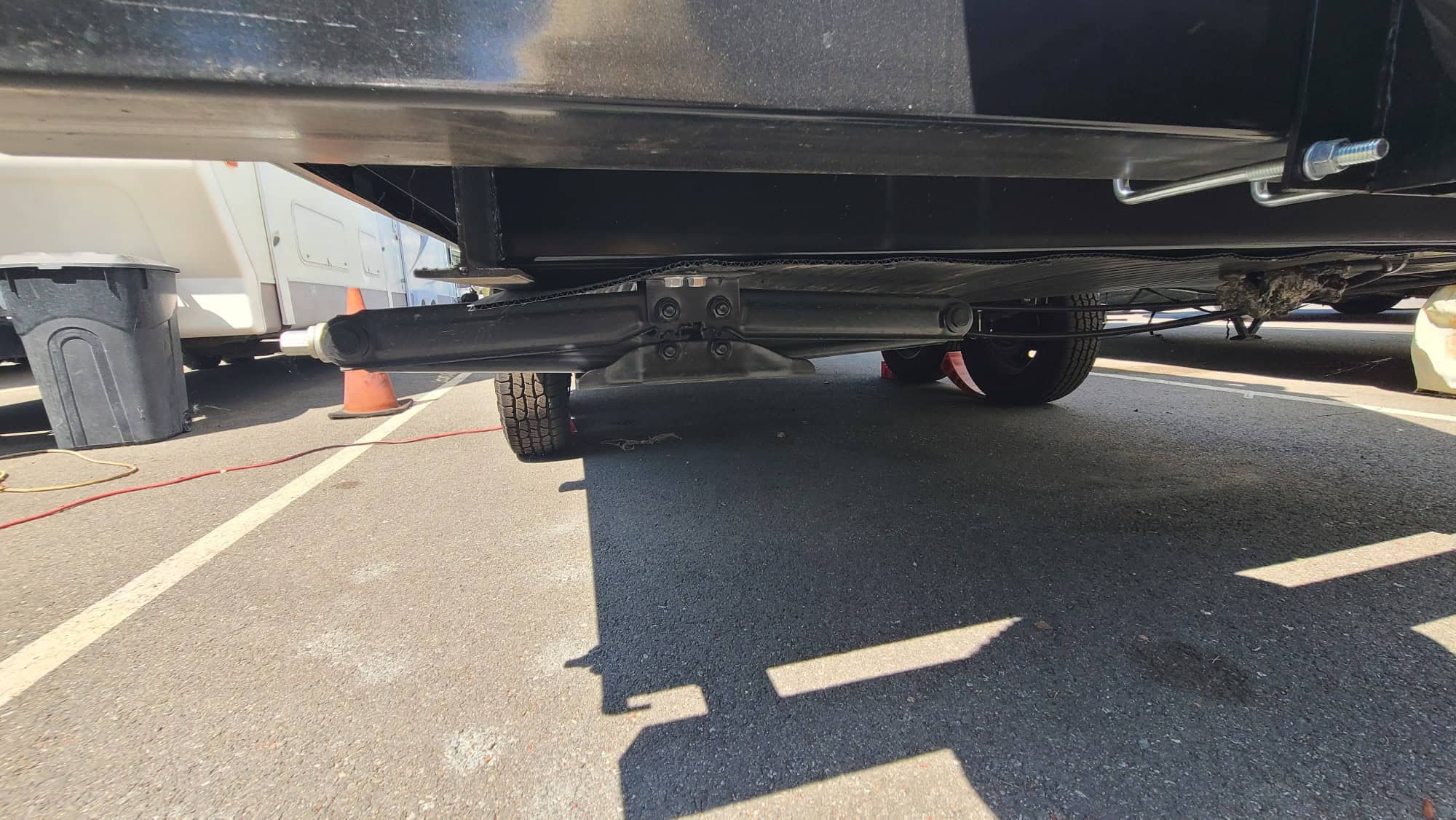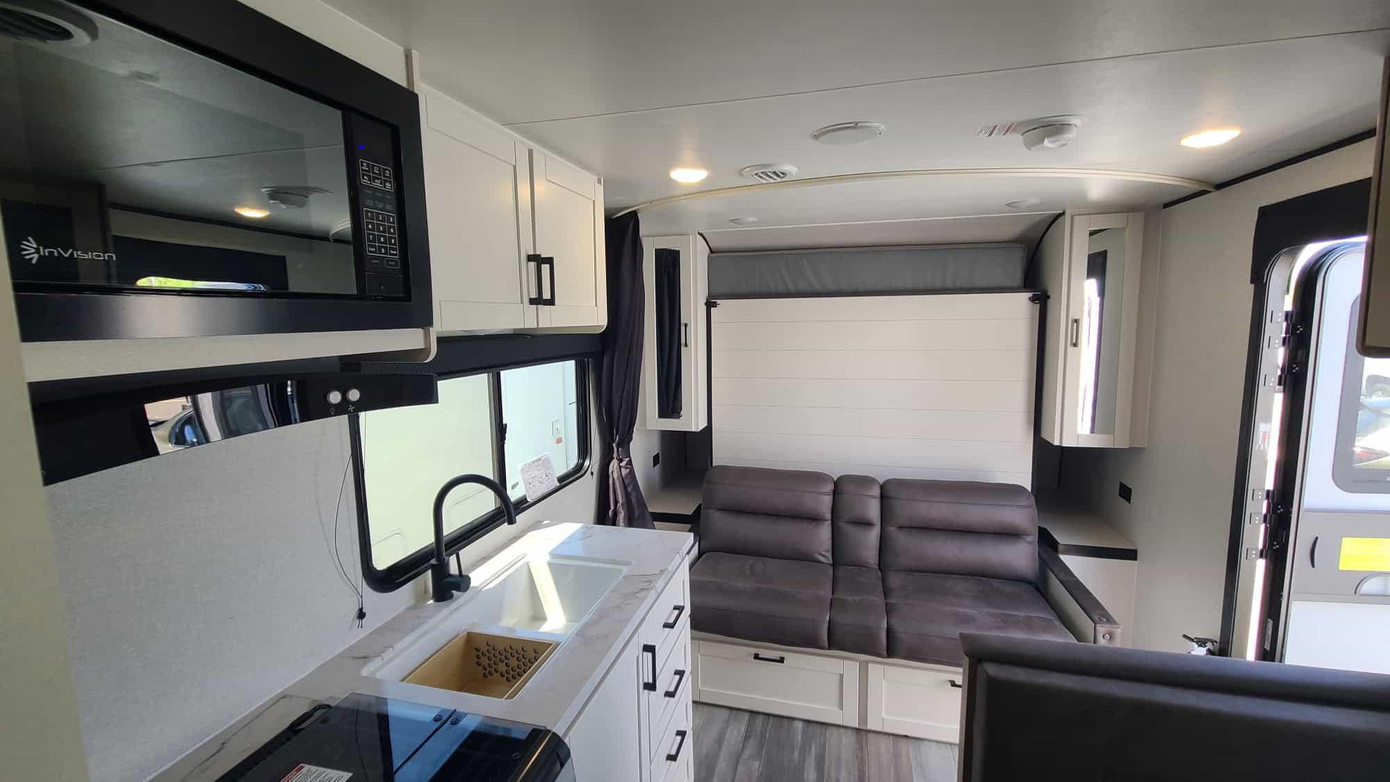 The pull down Murphy Bed is a breeze to open, and the two rear bunks are double sized- not tiny coffin-like cramped cubbies. This unit is loaded with all new extras, power cords, leveling blocks, 4 stabilizers front and rear for leveling. and, it’s never been slept in, toilet never used, and not a drop of water down the sink. Thanks to Prop 65, you will not find another unit like this anywhere in California! This is the perfect off road or Baja adventures vehicle!